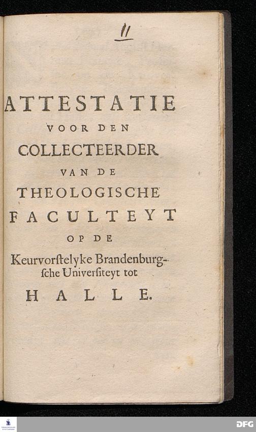 KORTE BESCHRYVING Van het onlangs opgerechte WEES-HUYS tot HALLE In't Hertogdom Maagdenburg Hoe het selve begonnen, en tegenwoortig gestelt is: Tot Prys van Gods trouwe Voorsorg, Tot verstercking van het vertrouwen op God, En tot verwecking van ware Christelyke Liefde; In't Hoogduyts opgestelt Door AUGUST HERMAN[!] FRANCKEN, Professor in de Griexsche en Orientaalsche Spraken, ende Leeraar aldaar. Beneffens twee Attestatien voor den Collecteerder. Uit het Hoogduyts in't Hollants overgeset. t'AMSTERDAM, By Johannes Smets en Paulus Dibbits, Boekdrukkers op de Nieuwe zyts Achterburgwal, 1697