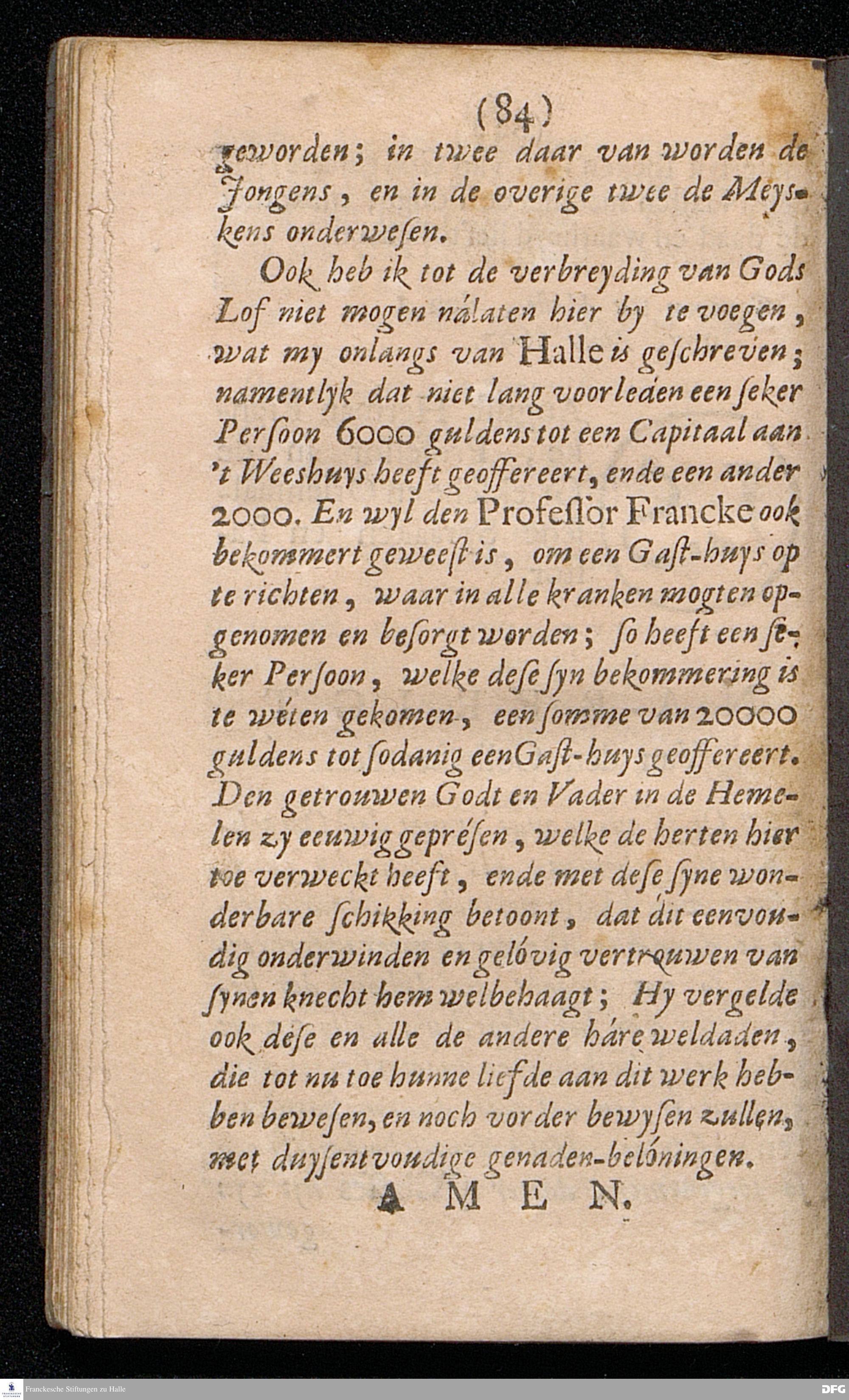 KORTE BESCHRYVING Van het onlangs opgerechte WEES-HUYS tot HALLE In't Hertogdom Maagdenburg Hoe het selve begonnen, en tegenwoortig gestelt is: Tot Prys van Gods trouwe Voorsorg, Tot verstercking van het vertrouwen op God, En tot verwecking van ware Christelyke Liefde; In't Hoogduyts opgestelt Door AUGUST HERMAN[!] FRANCKEN, Professor in de Griexsche en Orientaalsche Spraken, ende Leeraar aldaar. Beneffens twee Attestatien voor den Collecteerder. Uit het Hoogduyts in't Hollants overgeset. t'AMSTERDAM, By Johannes Smets en Paulus Dibbits, Boekdrukkers op de Nieuwe zyts Achterburgwal, 1697