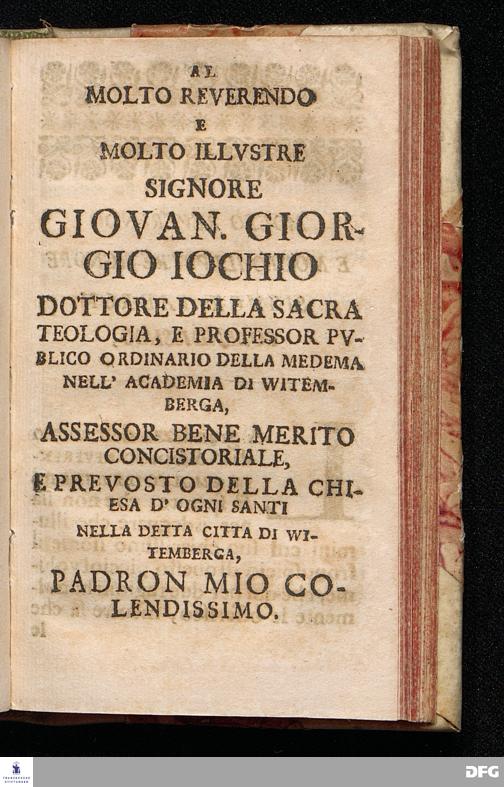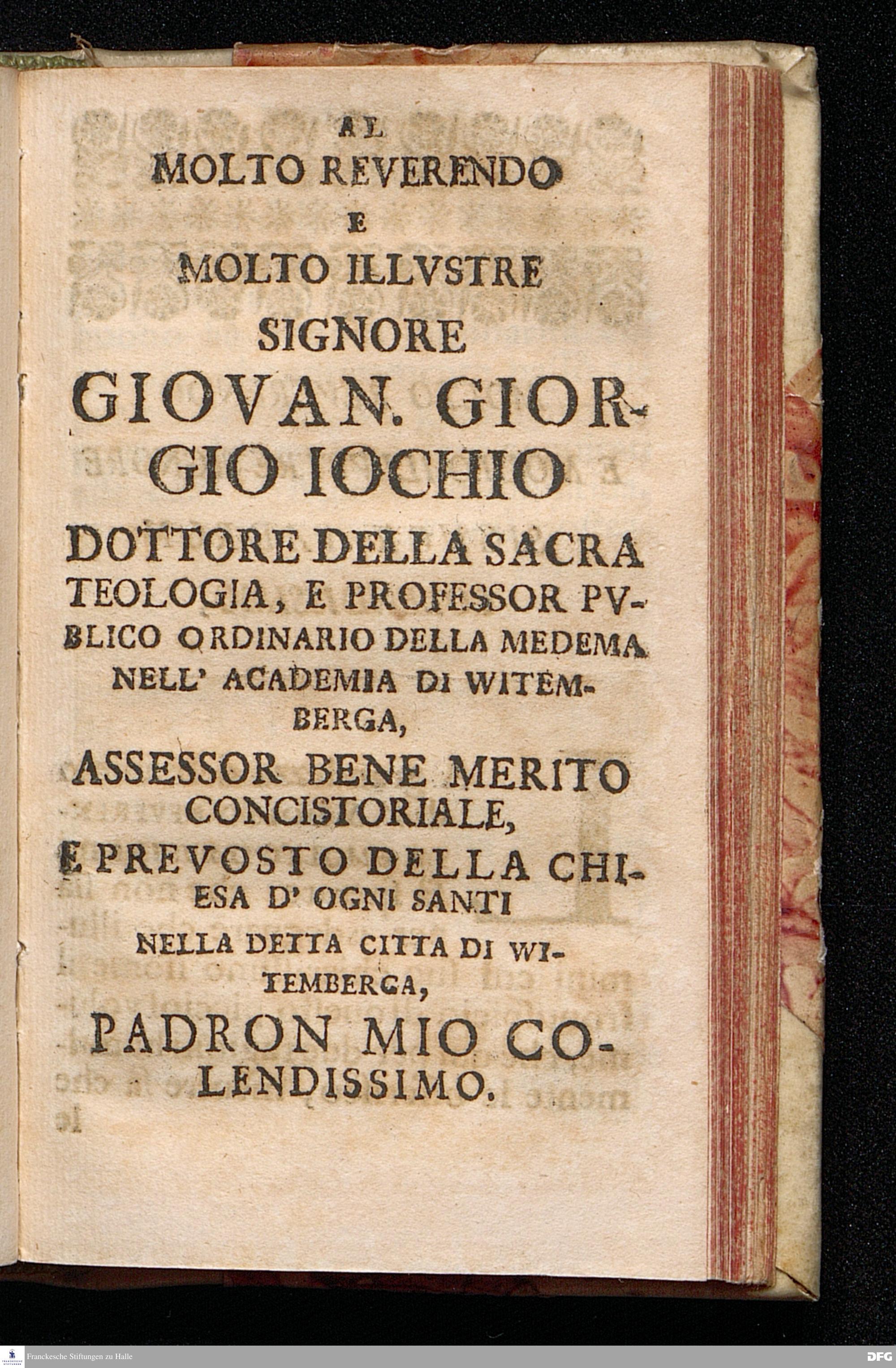 MEDITAZIONE SOPRA L' ABBONDANZA DE' DONI DELLO SPIRITO SANTO, COMPOSTA DALLA FELICE MEMORIA DEL MOLTO REVERENDO SIGNORE AVGVSTO HERMANNNO FRANCHIO FV GIA PROFESSORE ORDINARIO DI TEOLOGIA, PASTORE DELLA CHIESA DI S.VLRICO, DIRETTORE DEL PEDAGOGGIO REALE, E DELLA CASA DEGL'ORFANELLI: E TRADOTTA DALL' ALEMANNO NELL ITALIANO IDIOMA DA LODOVICO CRISTIANO VOCKERODT COLLEGA NEL PEDAGOGGIO REALE IN GLAVGA. HALA IN SASSONIA NELLA STAMPERIA DELLA VEDOVA LEHMANN. L'ANNO MDCCXXXI