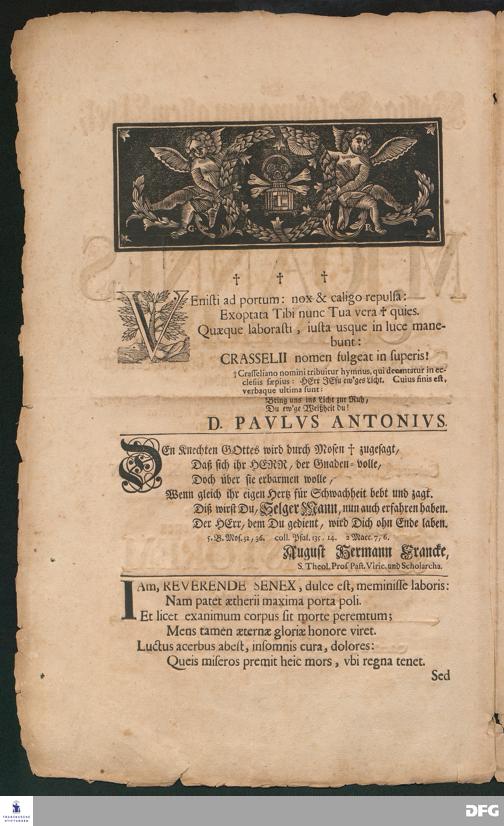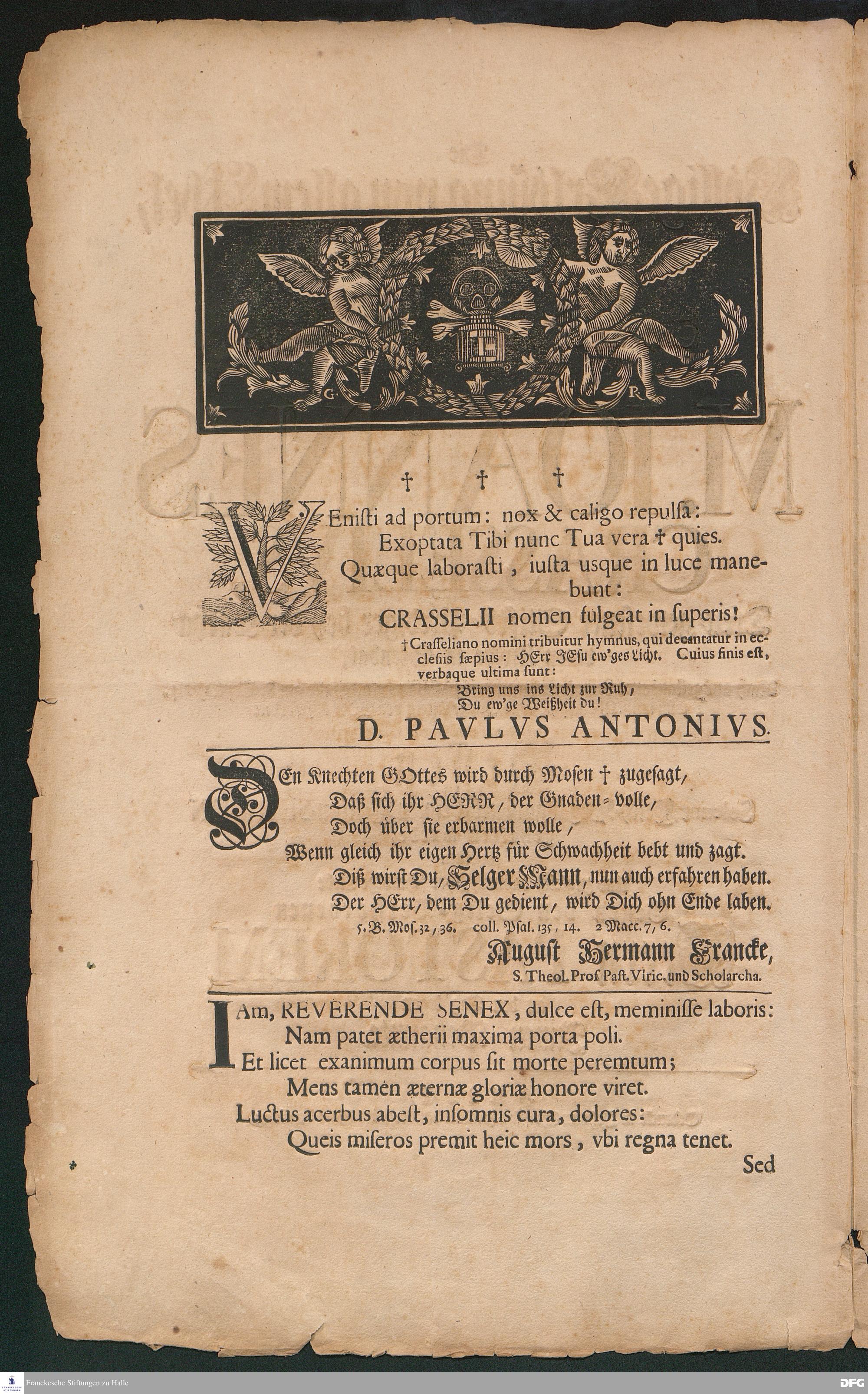 DEn Knechten GOttes wird durch Mosen zugesagt, Daß sich ihr HERR, der Gnaden=volle, Doch über sie erbarmen wolle,... [Verse auf den Tod von Johannes Crasselius.]