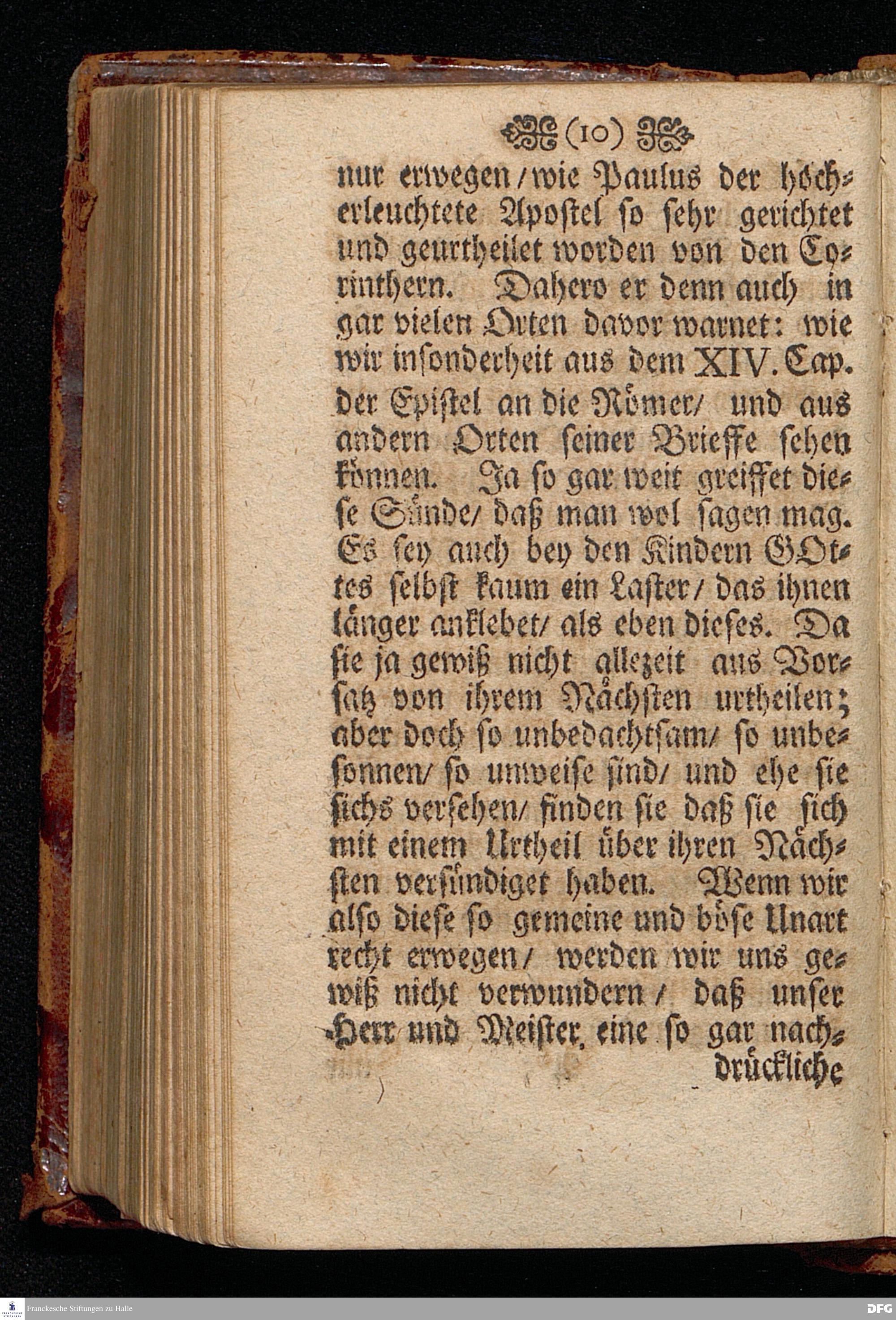 Das Gericht der Liebe über des Nächsten Gebrechen / Am 4.Sonntage nach Trinit. ANNO 1698. In einer Predigt Uber das Evangelium Luc.VI,vers.36==42. In der St.Georgen=Kirche zu Glaucha an Halle vorgestellet von M.August Hermann Francken / SS.Theol.Prof.Ord.& P.Glauch. HALLE / Gedruckt bey Johann Grunerten / Univers.Buchdr. 1701.