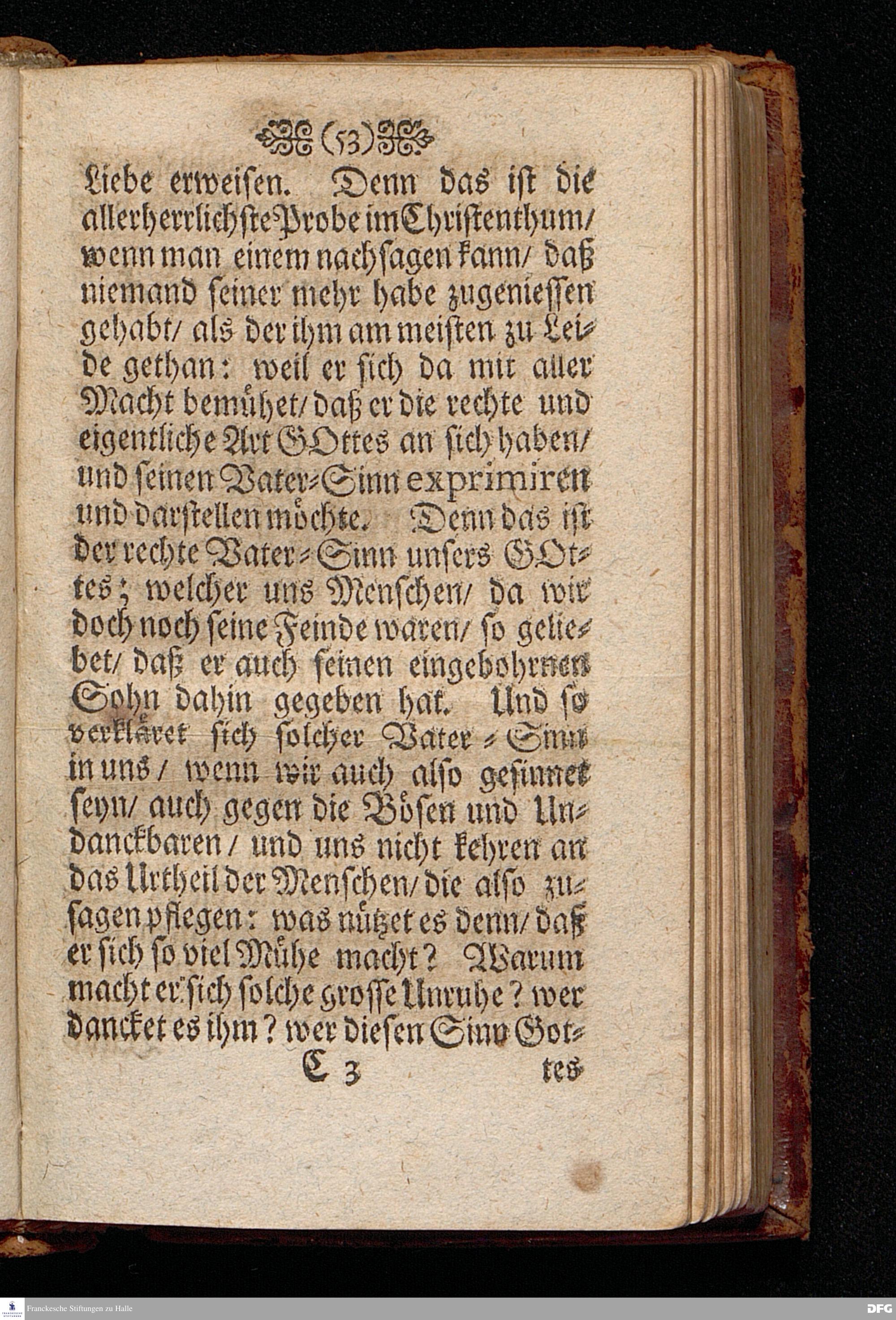 Das Gericht der Liebe über des Nächsten Gebrechen / Am 4.Sonntage nach Trinit. ANNO 1698. In einer Predigt Uber das Evangelium Luc.VI,vers.36==42. In der St.Georgen=Kirche zu Glaucha an Halle vorgestellet von M.August Hermann Francken / SS.Theol.Prof.Ord.& P.Glauch. HALLE / Gedruckt bey Johann Grunerten / Univers.Buchdr. 1701.