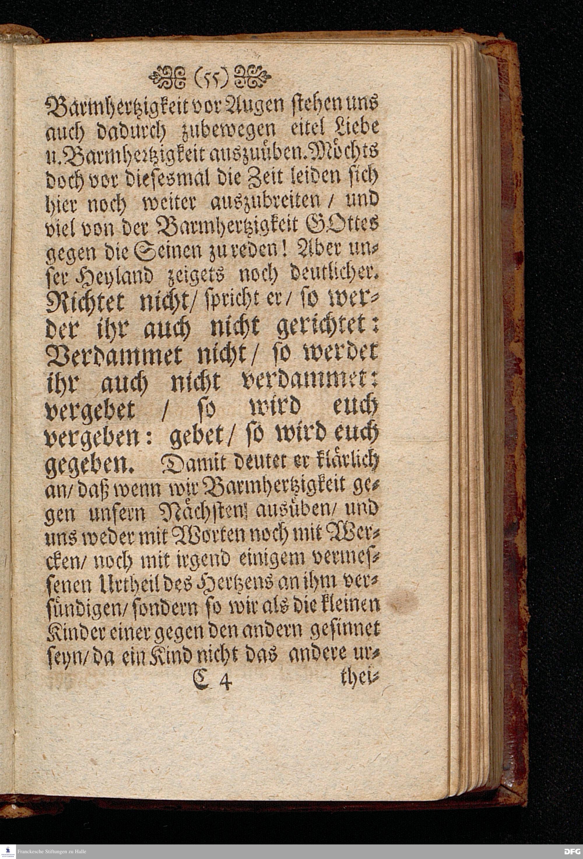 Das Gericht der Liebe über des Nächsten Gebrechen / Am 4.Sonntage nach Trinit. ANNO 1698. In einer Predigt Uber das Evangelium Luc.VI,vers.36==42. In der St.Georgen=Kirche zu Glaucha an Halle vorgestellet von M.August Hermann Francken / SS.Theol.Prof.Ord.& P.Glauch. HALLE / Gedruckt bey Johann Grunerten / Univers.Buchdr. 1701.