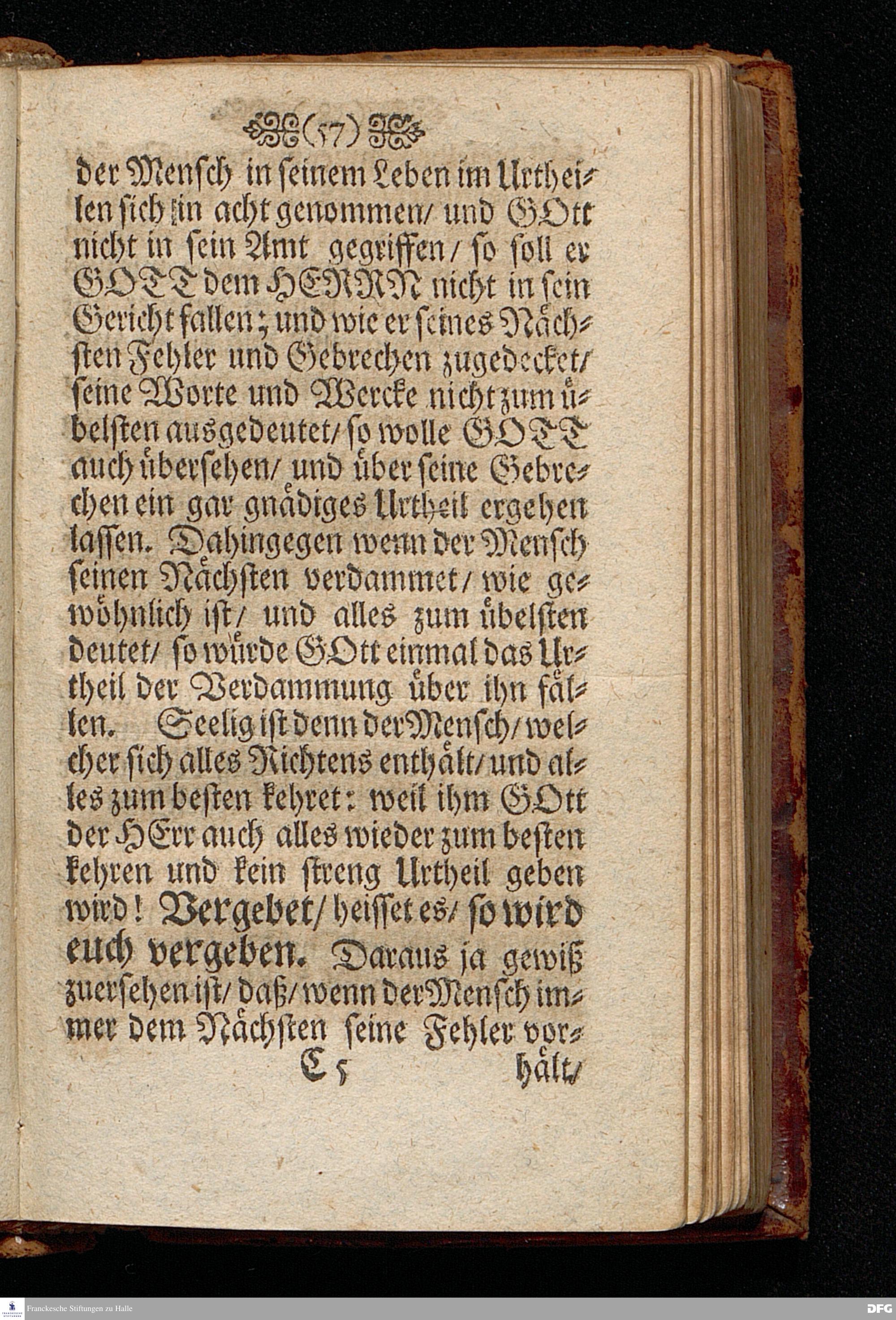 Das Gericht der Liebe über des Nächsten Gebrechen / Am 4.Sonntage nach Trinit. ANNO 1698. In einer Predigt Uber das Evangelium Luc.VI,vers.36==42. In der St.Georgen=Kirche zu Glaucha an Halle vorgestellet von M.August Hermann Francken / SS.Theol.Prof.Ord.& P.Glauch. HALLE / Gedruckt bey Johann Grunerten / Univers.Buchdr. 1701.
