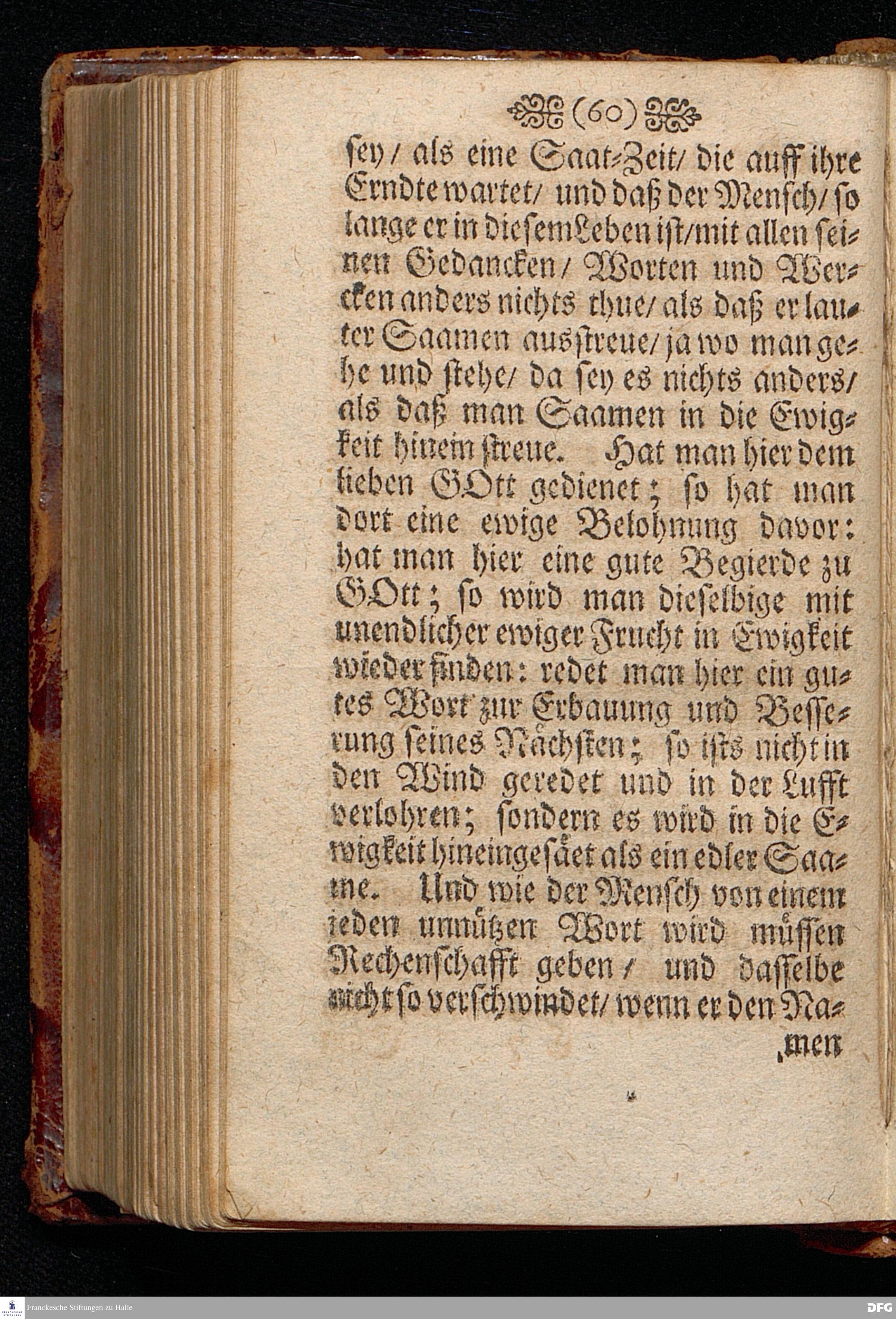 Das Gericht der Liebe über des Nächsten Gebrechen / Am 4.Sonntage nach Trinit. ANNO 1698. In einer Predigt Uber das Evangelium Luc.VI,vers.36==42. In der St.Georgen=Kirche zu Glaucha an Halle vorgestellet von M.August Hermann Francken / SS.Theol.Prof.Ord.& P.Glauch. HALLE / Gedruckt bey Johann Grunerten / Univers.Buchdr. 1701.