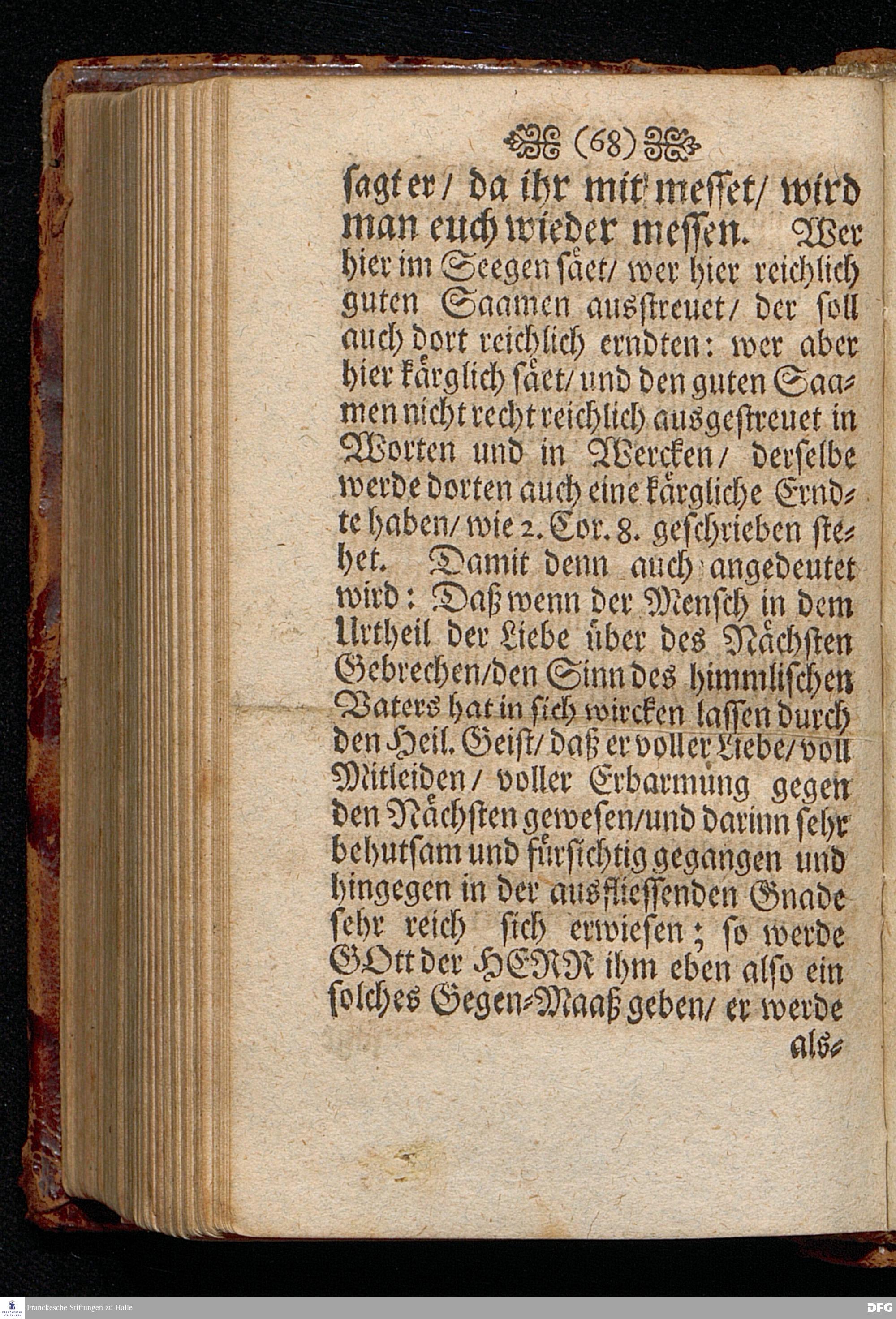 Das Gericht der Liebe über des Nächsten Gebrechen / Am 4.Sonntage nach Trinit. ANNO 1698. In einer Predigt Uber das Evangelium Luc.VI,vers.36==42. In der St.Georgen=Kirche zu Glaucha an Halle vorgestellet von M.August Hermann Francken / SS.Theol.Prof.Ord.& P.Glauch. HALLE / Gedruckt bey Johann Grunerten / Univers.Buchdr. 1701.