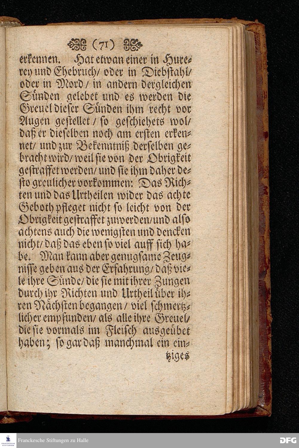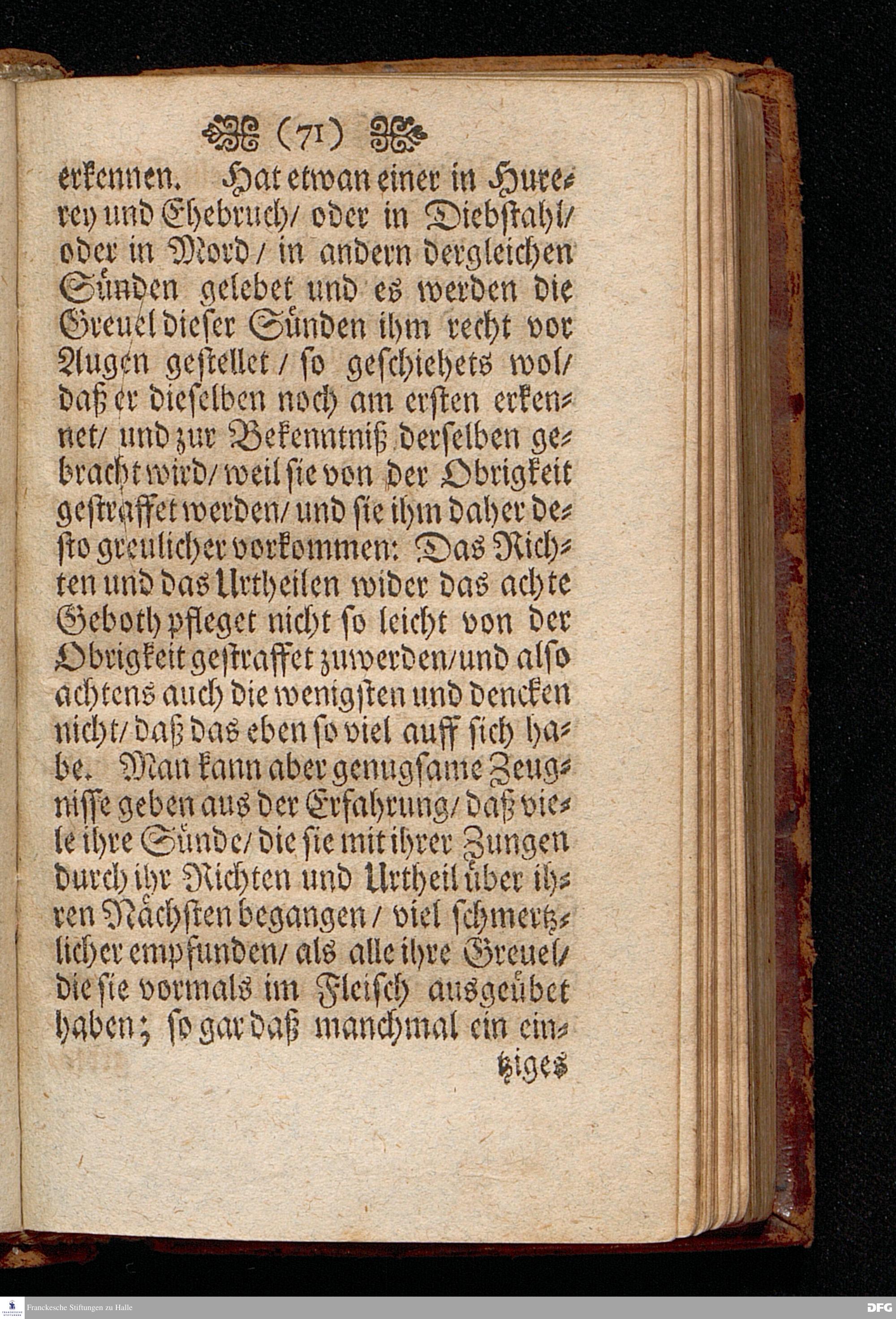 Das Gericht der Liebe über des Nächsten Gebrechen / Am 4.Sonntage nach Trinit. ANNO 1698. In einer Predigt Uber das Evangelium Luc.VI,vers.36==42. In der St.Georgen=Kirche zu Glaucha an Halle vorgestellet von M.August Hermann Francken / SS.Theol.Prof.Ord.& P.Glauch. HALLE / Gedruckt bey Johann Grunerten / Univers.Buchdr. 1701.