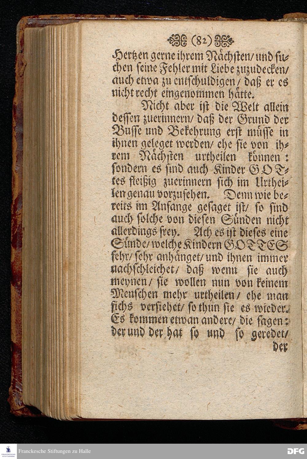 Das Gericht der Liebe über des Nächsten Gebrechen / Am 4.Sonntage nach Trinit. ANNO 1698. In einer Predigt Uber das Evangelium Luc.VI,vers.36==42. In der St.Georgen=Kirche zu Glaucha an Halle vorgestellet von M.August Hermann Francken / SS.Theol.Prof.Ord.& P.Glauch. HALLE / Gedruckt bey Johann Grunerten / Univers.Buchdr. 1701.