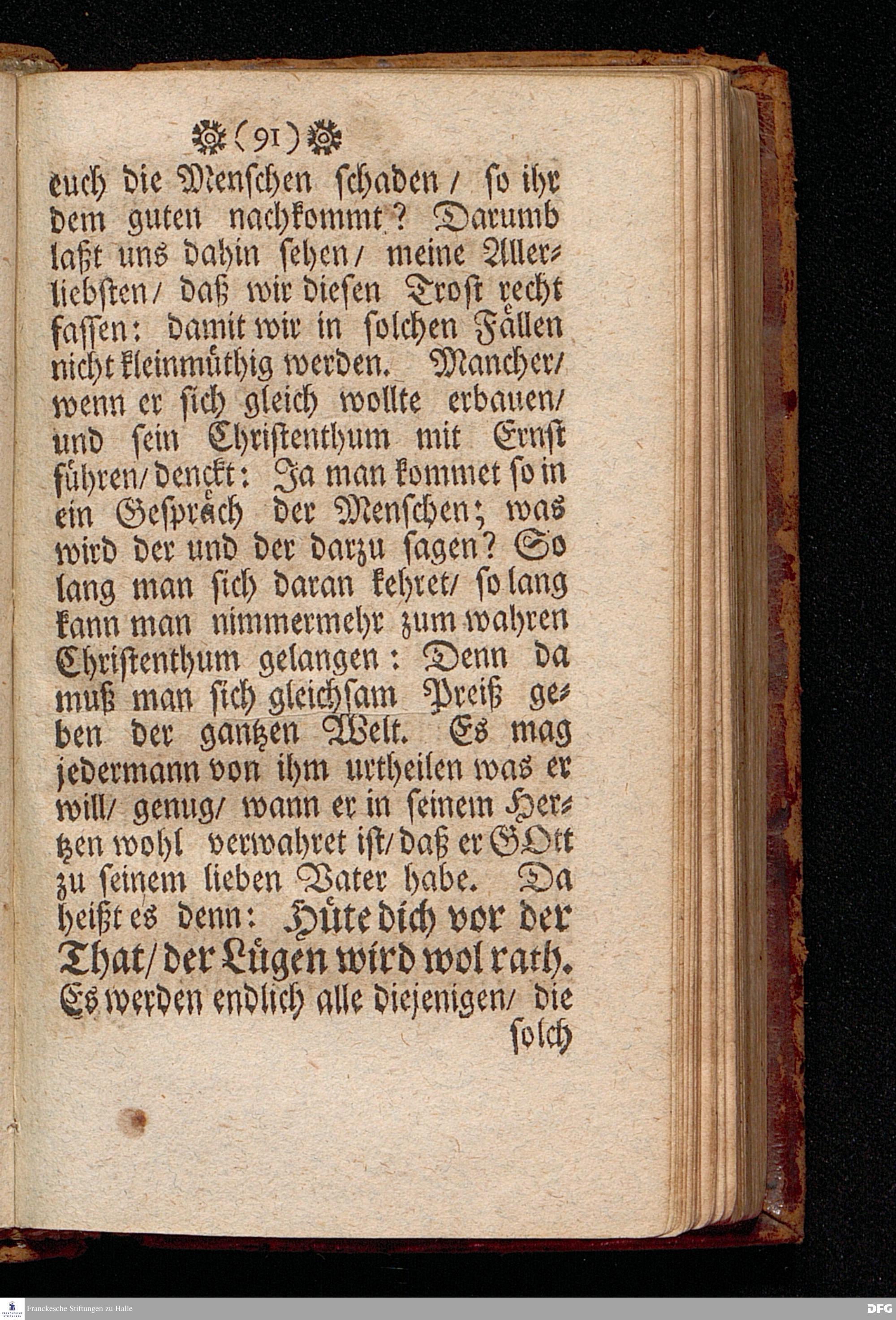 Das Gericht der Liebe über des Nächsten Gebrechen / Am 4.Sonntage nach Trinit. ANNO 1698. In einer Predigt Uber das Evangelium Luc.VI,vers.36==42. In der St.Georgen=Kirche zu Glaucha an Halle vorgestellet von M.August Hermann Francken / SS.Theol.Prof.Ord.& P.Glauch. HALLE / Gedruckt bey Johann Grunerten / Univers.Buchdr. 1701.