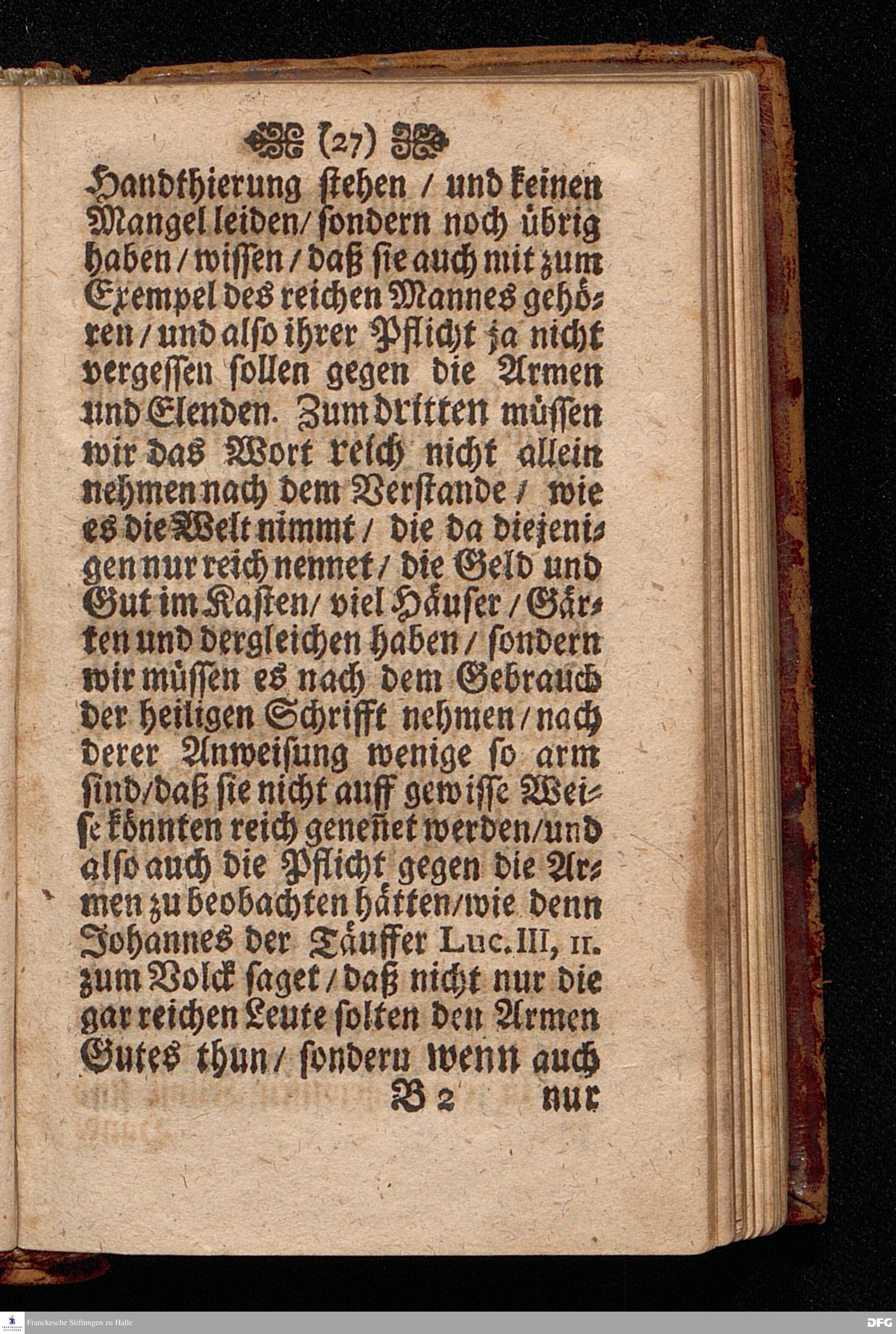 Die Pflicht gegen die Armen / Am I.Sonntage nach Trinit. Anno 1697. In einer Predigt Uber das Evangelium Luc.XVI. v.19--31. In der St.Georgen=Kirche zu Glaucha an Halle vorgestellet Und nunmehro zum dritten mahl herausgegeben von M.August Hermann Francken / S.S.Theol.P.Ord.& Past.Glauch. HALLE / Gedruckt bey Christian Henckeln / 1702.