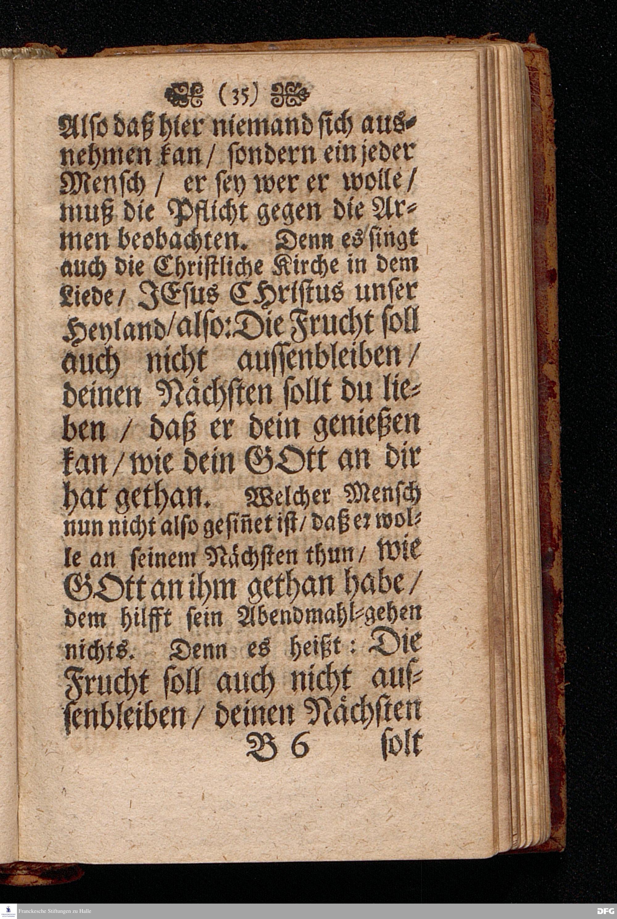 Die Pflicht gegen die Armen / Am I.Sonntage nach Trinit. Anno 1697. In einer Predigt Uber das Evangelium Luc.XVI. v.19--31. In der St.Georgen=Kirche zu Glaucha an Halle vorgestellet Und nunmehro zum dritten mahl herausgegeben von M.August Hermann Francken / S.S.Theol.P.Ord.& Past.Glauch. HALLE / Gedruckt bey Christian Henckeln / 1702.