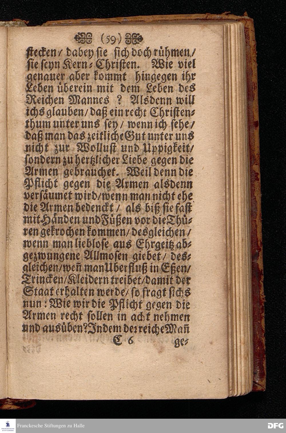 Die Pflicht gegen die Armen / Am I.Sonntage nach Trinit. Anno 1697. In einer Predigt Uber das Evangelium Luc.XVI. v.19--31. In der St.Georgen=Kirche zu Glaucha an Halle vorgestellet Und nunmehro zum dritten mahl herausgegeben von M.August Hermann Francken / S.S.Theol.P.Ord.& Past.Glauch. HALLE / Gedruckt bey Christian Henckeln / 1702.