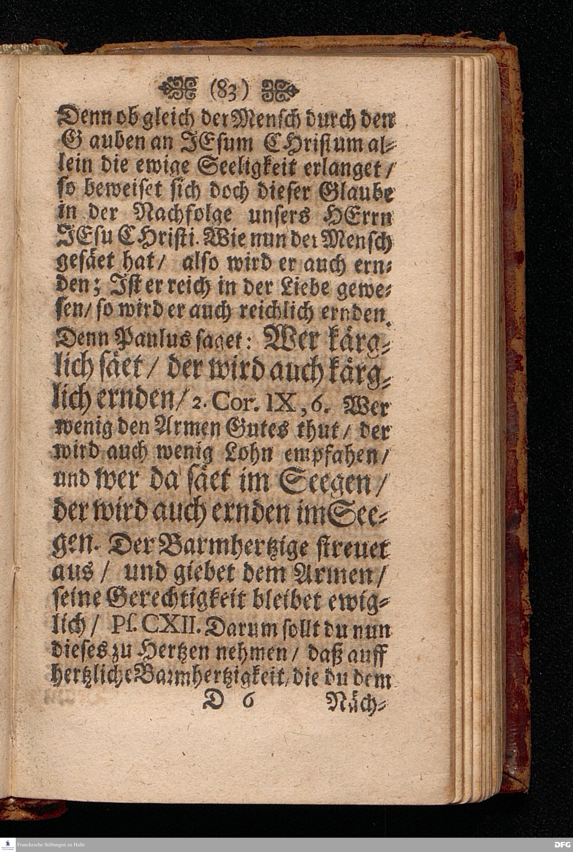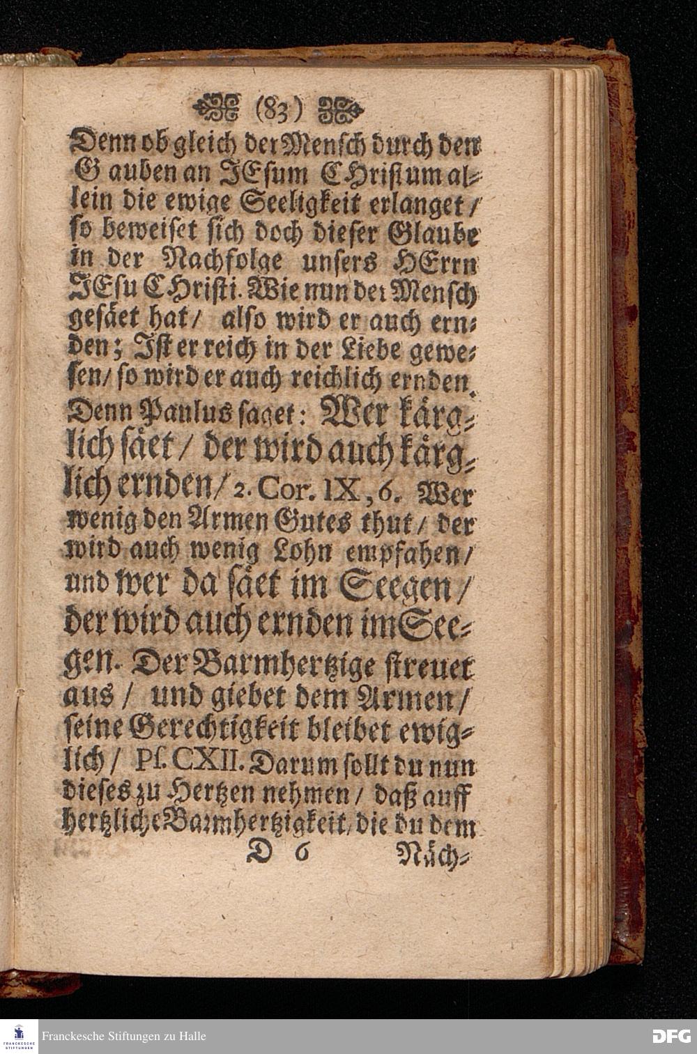 Die Pflicht gegen die Armen / Am I.Sonntage nach Trinit. Anno 1697. In einer Predigt Uber das Evangelium Luc.XVI. v.19--31. In der St.Georgen=Kirche zu Glaucha an Halle vorgestellet Und nunmehro zum dritten mahl herausgegeben von M.August Hermann Francken / S.S.Theol.P.Ord.& Past.Glauch. HALLE / Gedruckt bey Christian Henckeln / 1702.
