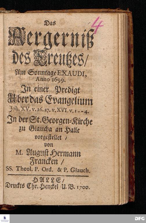 Das Aergerniß des Crentzes [!] / Am Sonntage EXAUDI, Anno 1699. In einer Predigt Uber das Evangelium Joh.XV, v.26.27. v. XVI, v.1--4. In der St.Georgen=Kirche zu Glaucha an Halle vorgestellet / von M.August Hermann Francken / SS.Theol.P.Ord.& P.Glauch. HALLE / Druckts Chr.Henckel U.B.1700.
