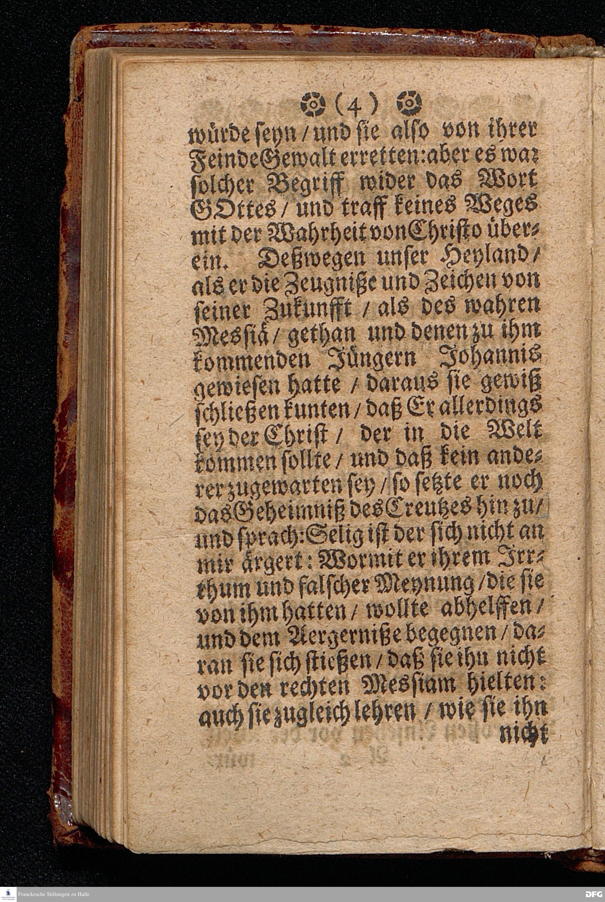 Das Aergerniß des Crentzes [!] / Am Sonntage EXAUDI, Anno 1699. In einer Predigt Uber das Evangelium Joh.XV, v.26.27. v. XVI, v.1--4. In der St.Georgen=Kirche zu Glaucha an Halle vorgestellet / von M.August Hermann Francken / SS.Theol.P.Ord.& P.Glauch. HALLE / Druckts Chr.Henckel U.B.1700.