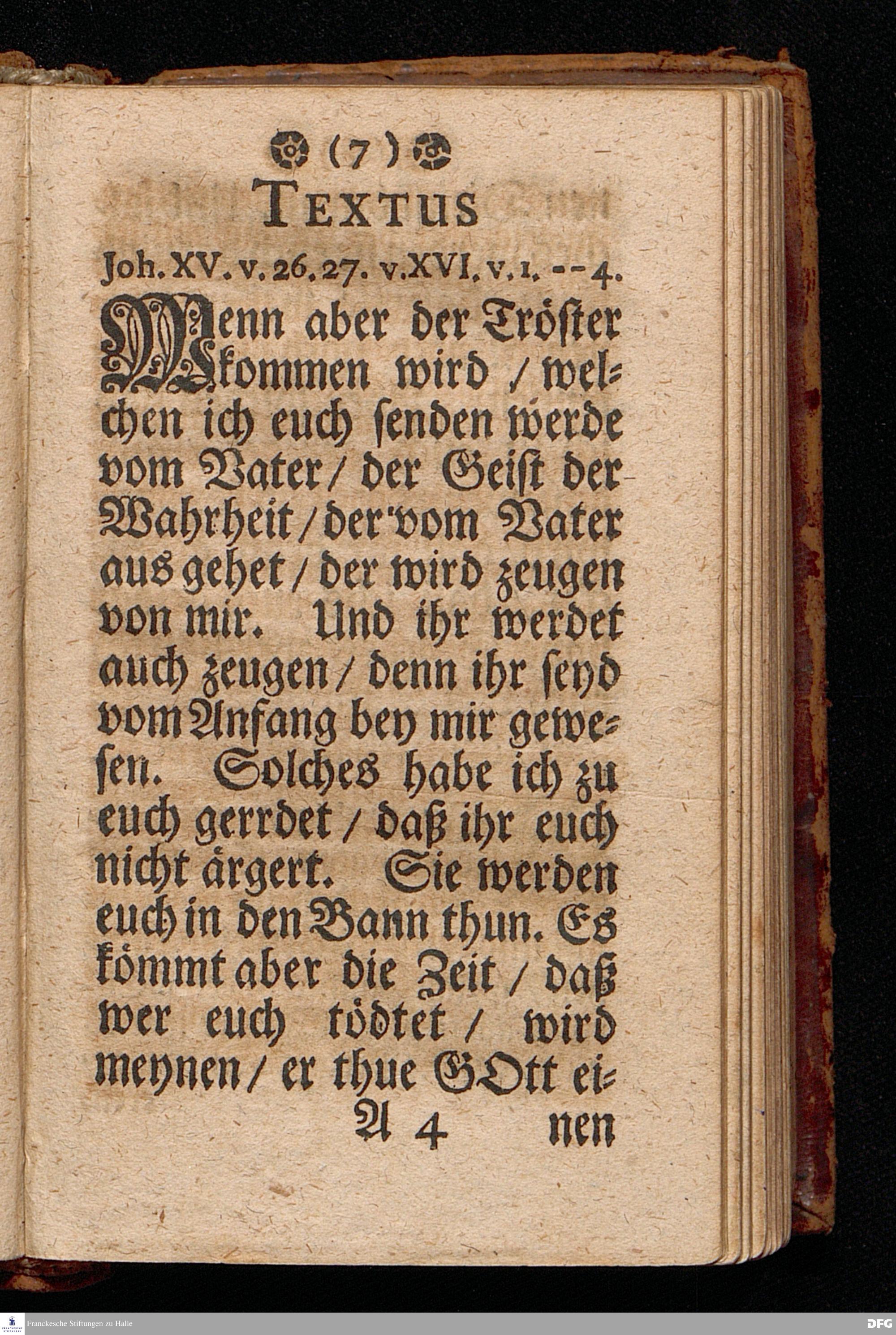 Das Aergerniß des Crentzes [!] / Am Sonntage EXAUDI, Anno 1699. In einer Predigt Uber das Evangelium Joh.XV, v.26.27. v. XVI, v.1--4. In der St.Georgen=Kirche zu Glaucha an Halle vorgestellet / von M.August Hermann Francken / SS.Theol.P.Ord.& P.Glauch. HALLE / Druckts Chr.Henckel U.B.1700.