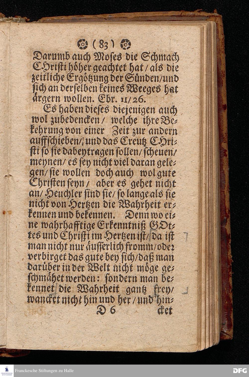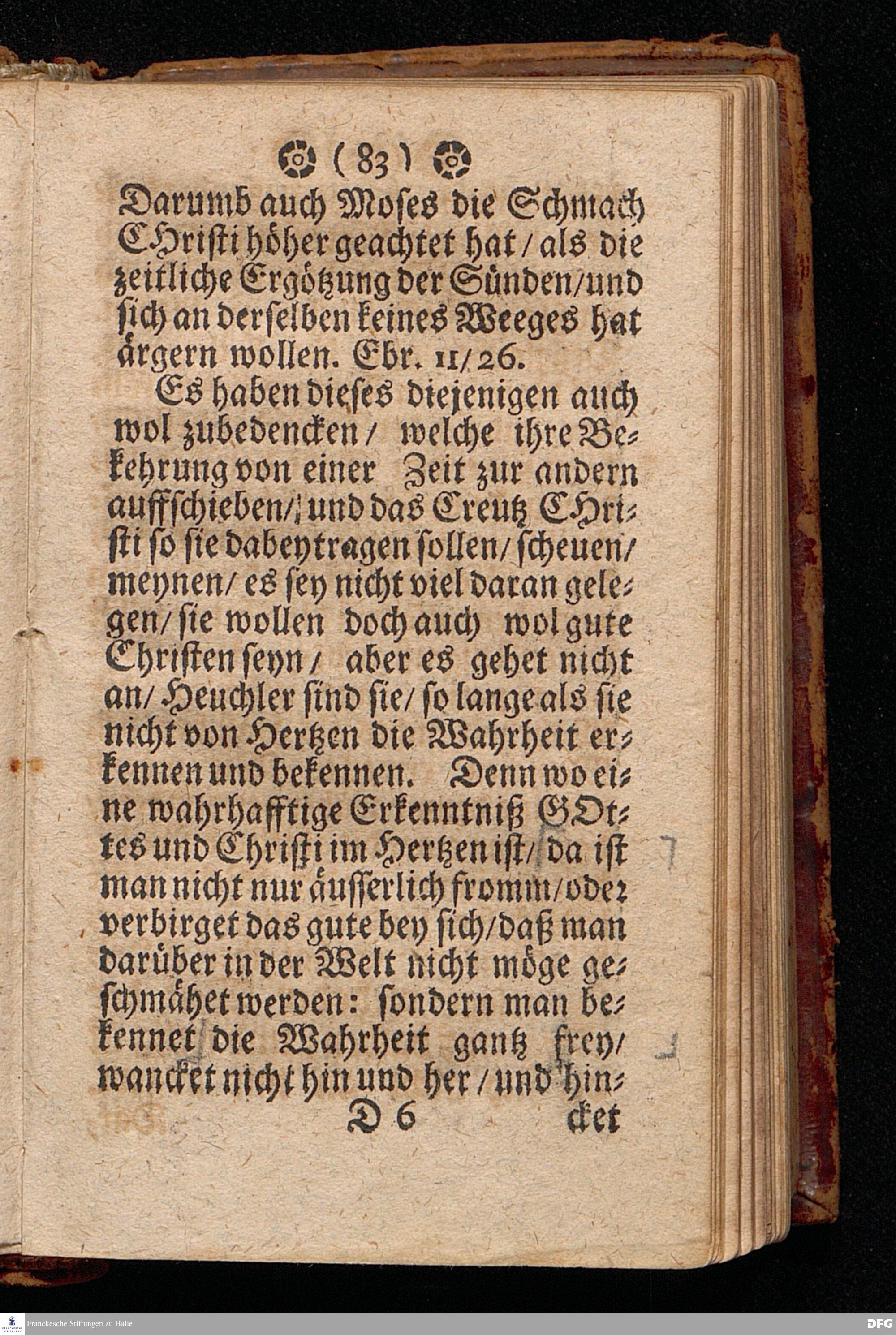 Das Aergerniß des Crentzes [!] / Am Sonntage EXAUDI, Anno 1699. In einer Predigt Uber das Evangelium Joh.XV, v.26.27. v. XVI, v.1--4. In der St.Georgen=Kirche zu Glaucha an Halle vorgestellet / von M.August Hermann Francken / SS.Theol.P.Ord.& P.Glauch. HALLE / Druckts Chr.Henckel U.B.1700.