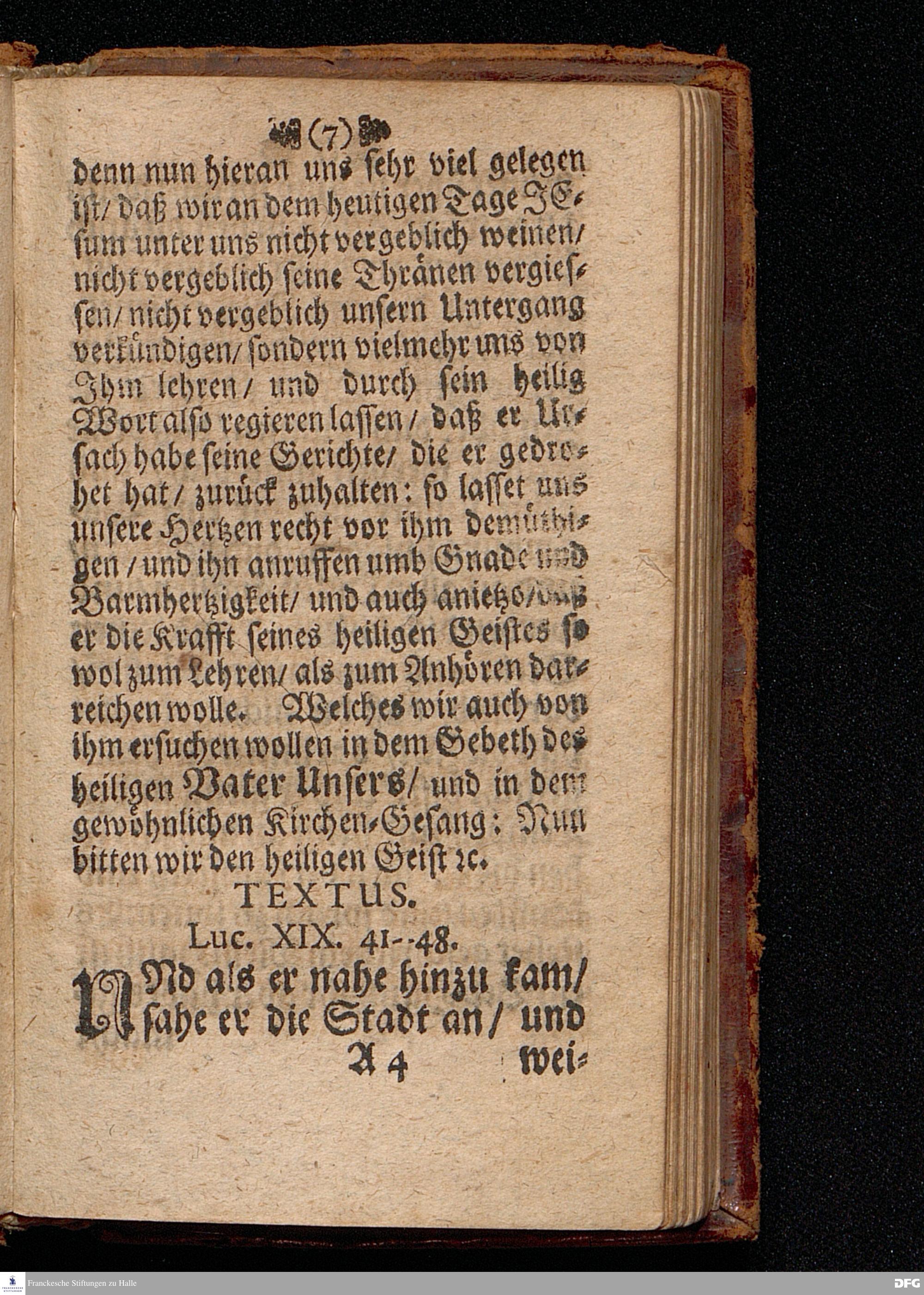 Die Höchstnöthige Kirchen= Hauß= und Hertzens=Reformation Am X.Sonntage nach Trinit. ANNO 1697. In einer Predigt Uber das Evangelium Luc.XIX,vers.41==48.In der St.Georgen=Kirche zu Glaucha an Halle vorgestellet von M.August Hermann Francken / SS.Theol.P.P.Ord.& P.Glauch. HALLE / In Verlegung des Wäysen=Hauses / 1702.