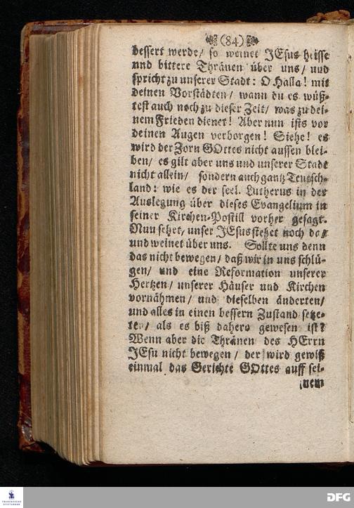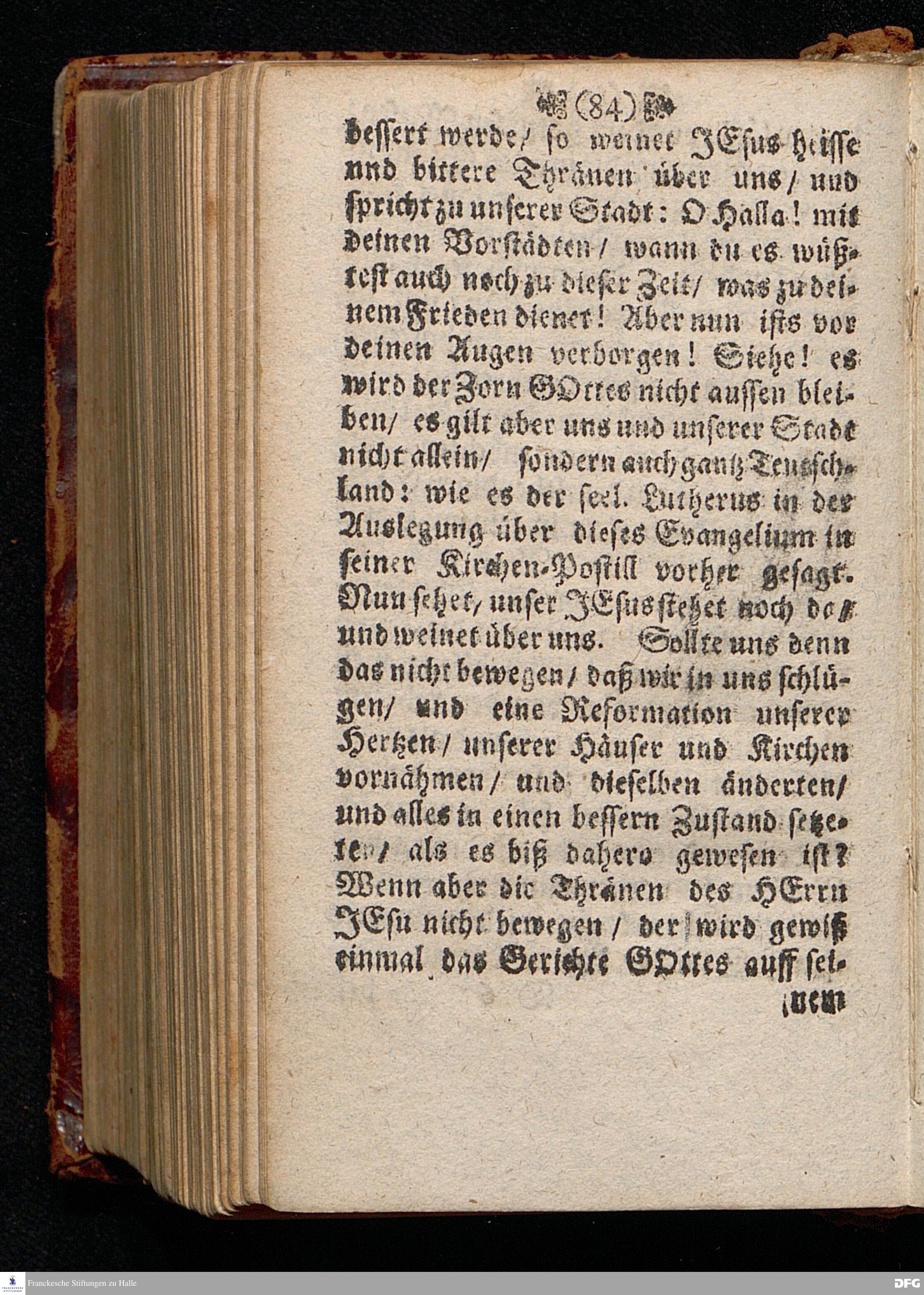 Die Höchstnöthige Kirchen= Hauß= und Hertzens=Reformation Am X.Sonntage nach Trinit. ANNO 1697. In einer Predigt Uber das Evangelium Luc.XIX,vers.41==48.In der St.Georgen=Kirche zu Glaucha an Halle vorgestellet von M.August Hermann Francken / SS.Theol.P.P.Ord.& P.Glauch. HALLE / In Verlegung des Wäysen=Hauses / 1702.