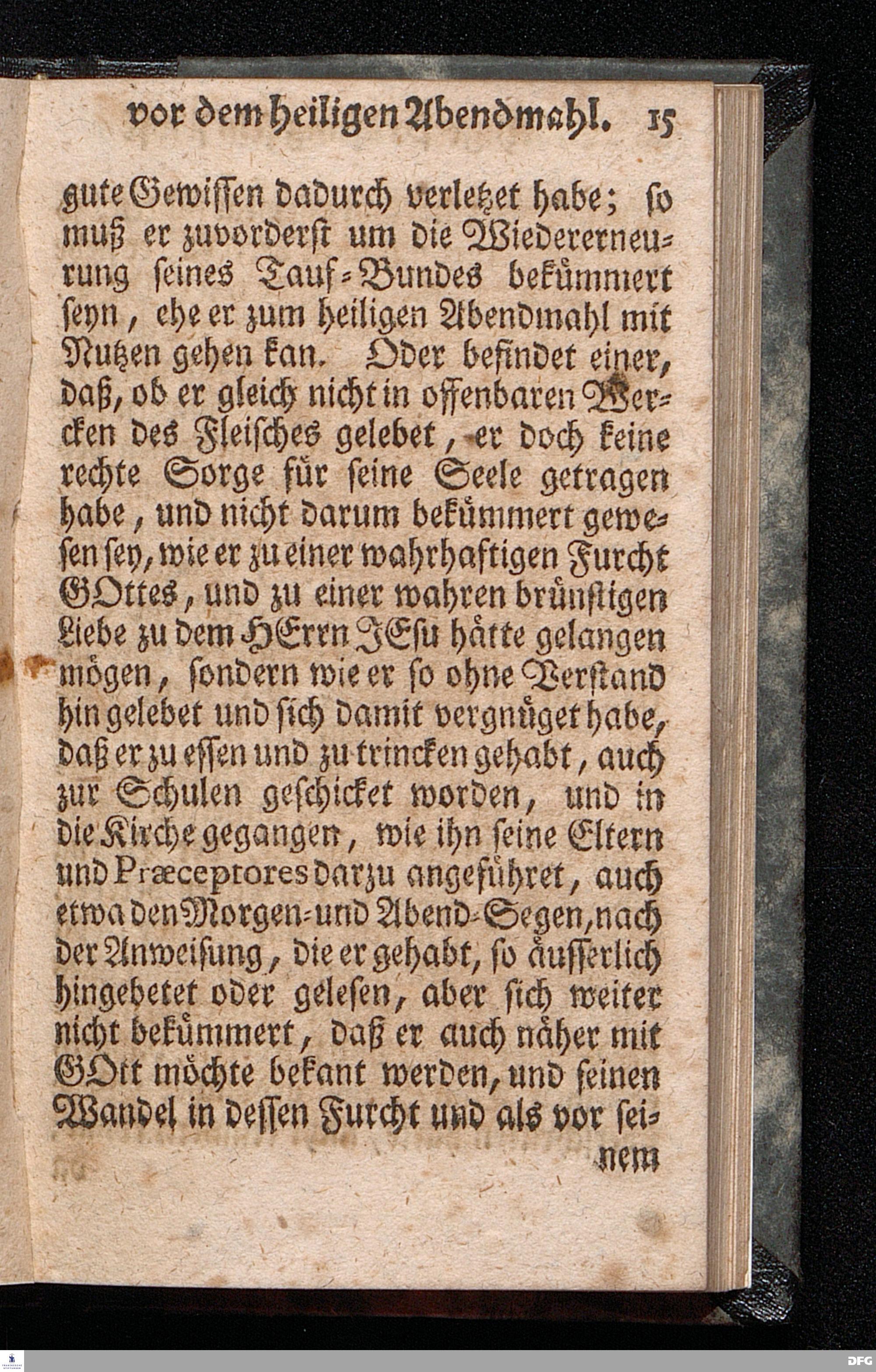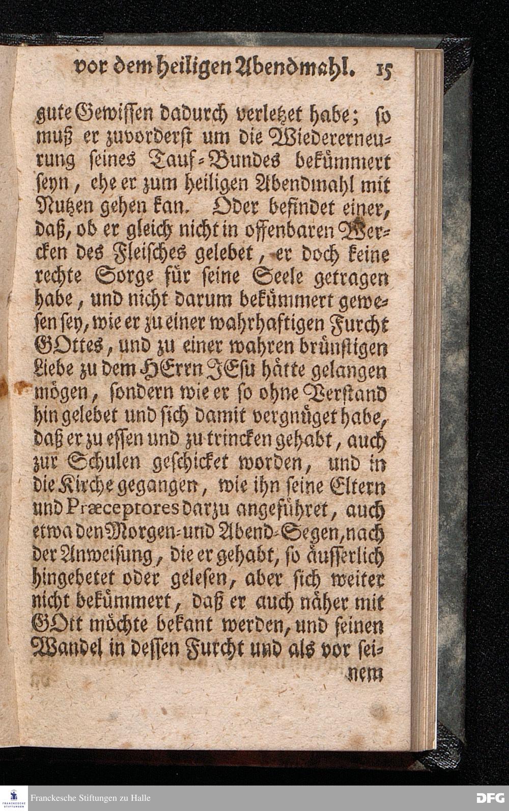 Die nöthige Prüfung sein selbst vor dem Gebrauch des Heiligen Abendmahls / Nach Anleitung der Epistol.Lection 1.Cor.IX [vielm.XI !], v.23 u.s.f. An dem so genannten Grünen Donnerstage Anno 1712. In der St.Georgen Kirche zu Glaucha an Halle vorgestellet, Und insonderheit mit zu einem Unterricht für diejenige, so sich aus mancherley Ursachen vom H.Abendmahl enthalten, gerichtet von August Hermann Francken / S.Th.P.O. & Past.zu St.Ulrich, u. des Gymn.Schol. Die fünfte Edition. Dabey ein Anhang von der unterschiedenen Beschaffenheit der würdigen Communicanten vom Autore zu Nürnberg vorgestellet den 6ten Mart. anno 1718. Der Jugend in den Schulen des Wäysen=Hauses nach gehaltenem Herbst=Examine ausgetheilet. HALLE, in Verlegung des Wäysenhauses, 1728.