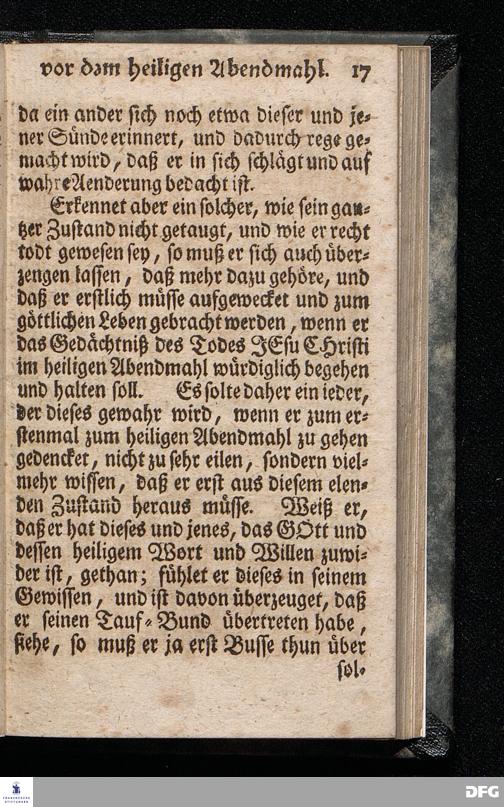Die nöthige Prüfung sein selbst vor dem Gebrauch des Heiligen Abendmahls / Nach Anleitung der Epistol.Lection 1.Cor.IX [vielm.XI !], v.23 u.s.f. An dem so genannten Grünen Donnerstage Anno 1712. In der St.Georgen Kirche zu Glaucha an Halle vorgestellet, Und insonderheit mit zu einem Unterricht für diejenige, so sich aus mancherley Ursachen vom H.Abendmahl enthalten, gerichtet von August Hermann Francken / S.Th.P.O. & Past.zu St.Ulrich, u. des Gymn.Schol. Die fünfte Edition. Dabey ein Anhang von der unterschiedenen Beschaffenheit der würdigen Communicanten vom Autore zu Nürnberg vorgestellet den 6ten Mart. anno 1718. Der Jugend in den Schulen des Wäysen=Hauses nach gehaltenem Herbst=Examine ausgetheilet. HALLE, in Verlegung des Wäysenhauses, 1728.