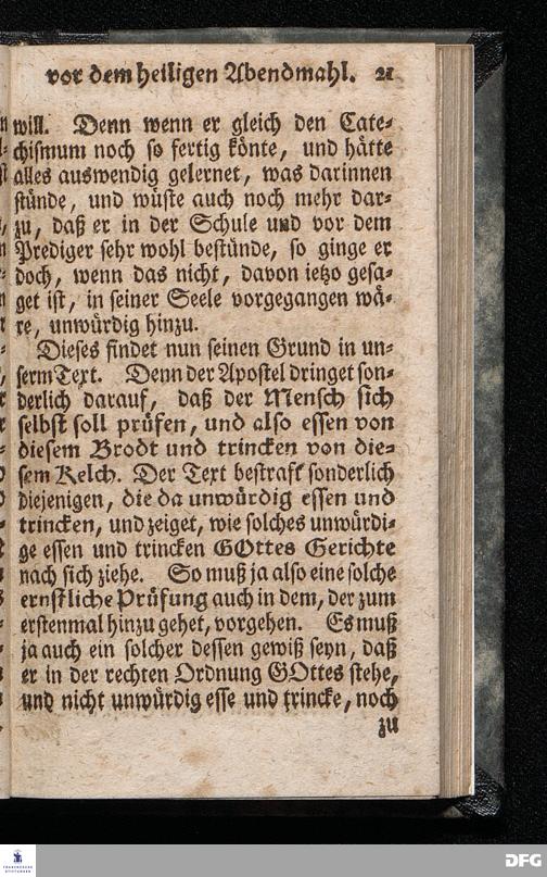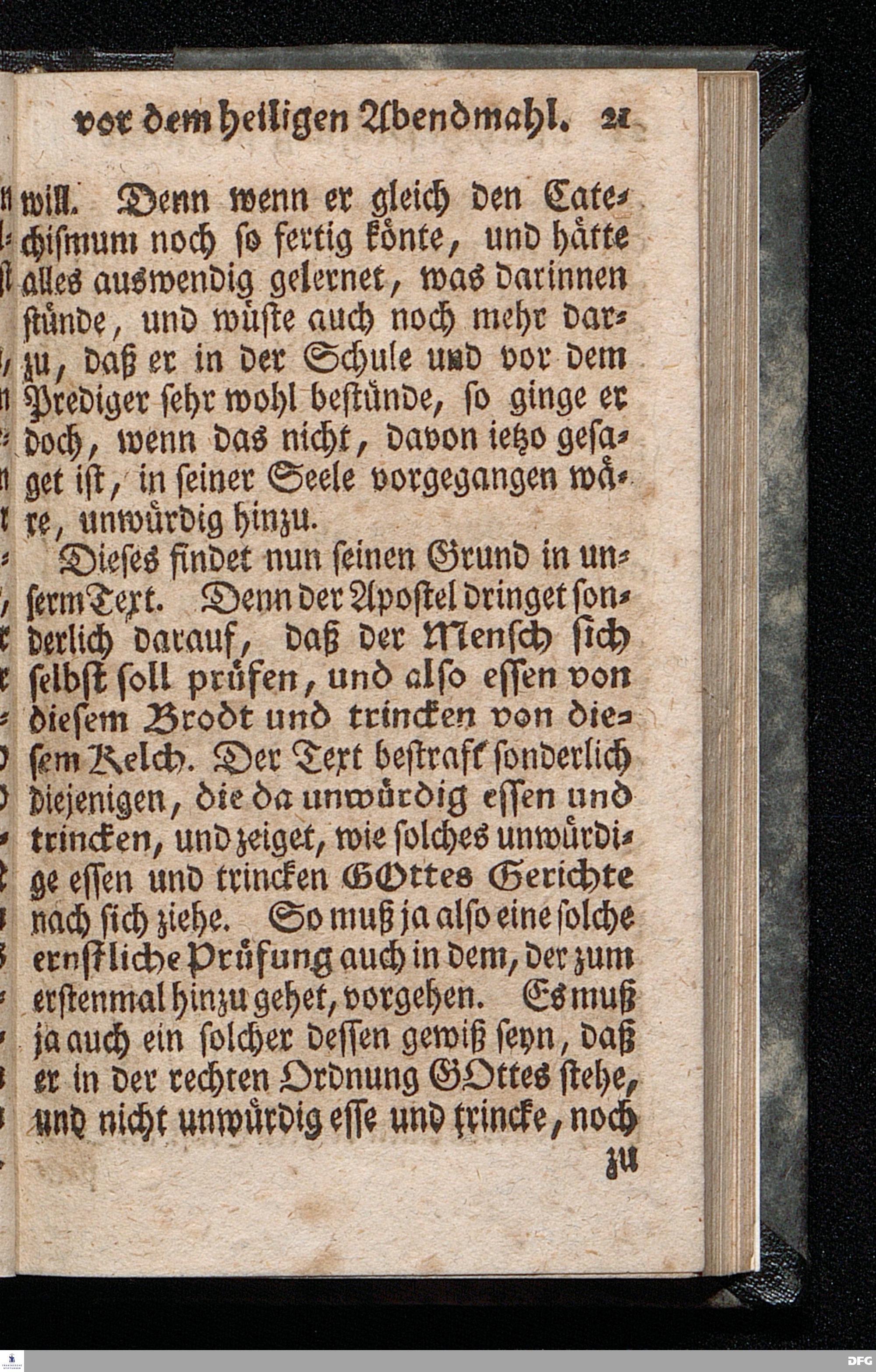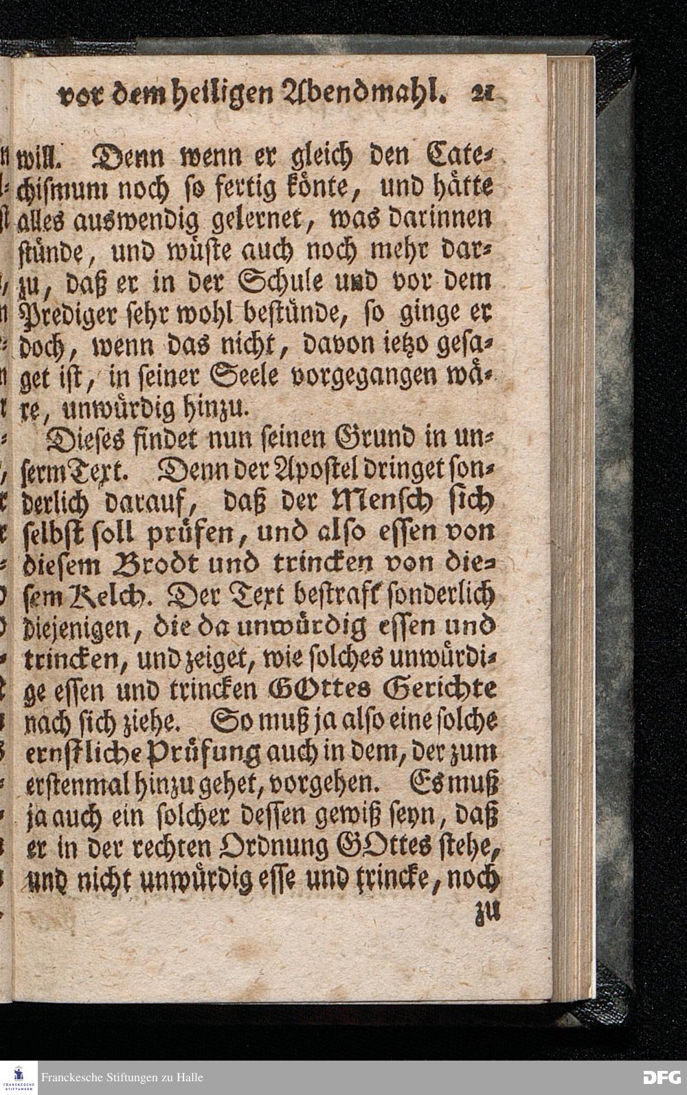 Die nöthige Prüfung sein selbst vor dem Gebrauch des Heiligen Abendmahls / Nach Anleitung der Epistol.Lection 1.Cor.IX [vielm.XI !], v.23 u.s.f. An dem so genannten Grünen Donnerstage Anno 1712. In der St.Georgen Kirche zu Glaucha an Halle vorgestellet, Und insonderheit mit zu einem Unterricht für diejenige, so sich aus mancherley Ursachen vom H.Abendmahl enthalten, gerichtet von August Hermann Francken / S.Th.P.O. & Past.zu St.Ulrich, u. des Gymn.Schol. Die fünfte Edition. Dabey ein Anhang von der unterschiedenen Beschaffenheit der würdigen Communicanten vom Autore zu Nürnberg vorgestellet den 6ten Mart. anno 1718. Der Jugend in den Schulen des Wäysen=Hauses nach gehaltenem Herbst=Examine ausgetheilet. HALLE, in Verlegung des Wäysenhauses, 1728.