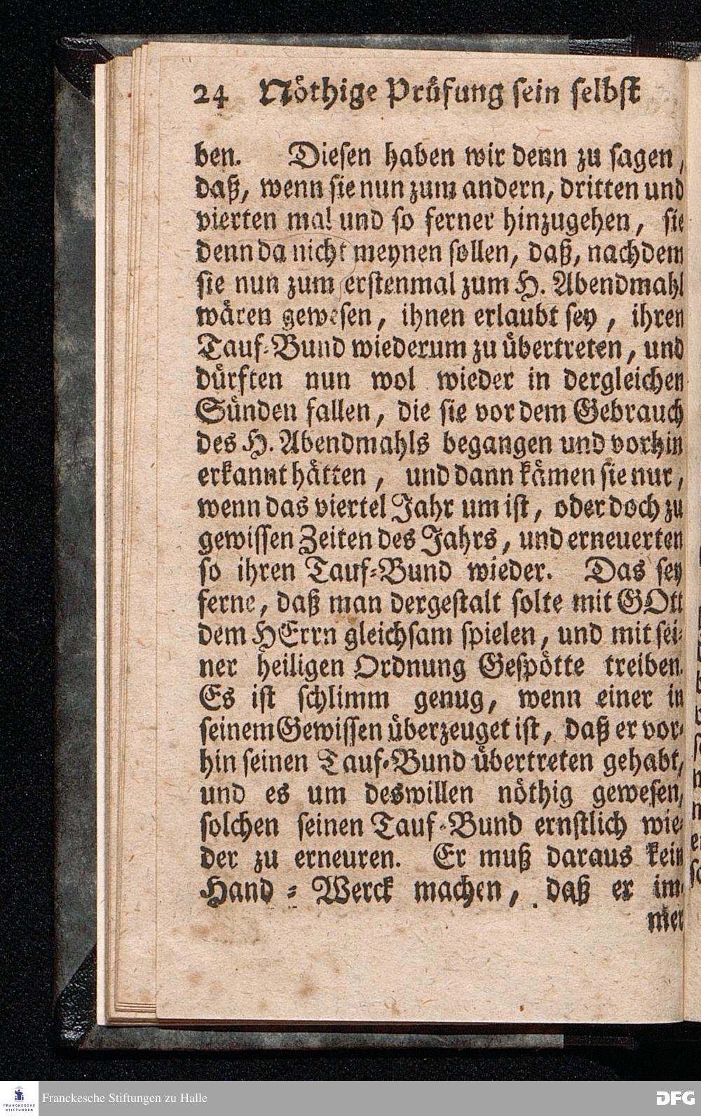 Die nöthige Prüfung sein selbst vor dem Gebrauch des Heiligen Abendmahls / Nach Anleitung der Epistol.Lection 1.Cor.IX [vielm.XI !], v.23 u.s.f. An dem so genannten Grünen Donnerstage Anno 1712. In der St.Georgen Kirche zu Glaucha an Halle vorgestellet, Und insonderheit mit zu einem Unterricht für diejenige, so sich aus mancherley Ursachen vom H.Abendmahl enthalten, gerichtet von August Hermann Francken / S.Th.P.O. & Past.zu St.Ulrich, u. des Gymn.Schol. Die fünfte Edition. Dabey ein Anhang von der unterschiedenen Beschaffenheit der würdigen Communicanten vom Autore zu Nürnberg vorgestellet den 6ten Mart. anno 1718. Der Jugend in den Schulen des Wäysen=Hauses nach gehaltenem Herbst=Examine ausgetheilet. HALLE, in Verlegung des Wäysenhauses, 1728.