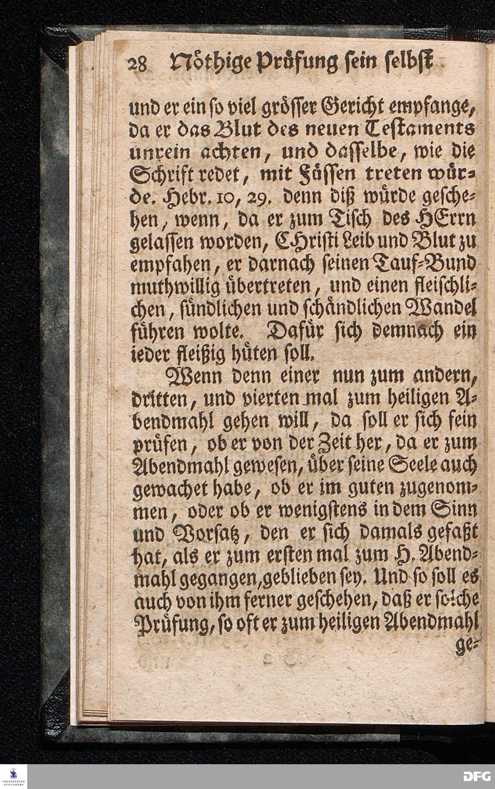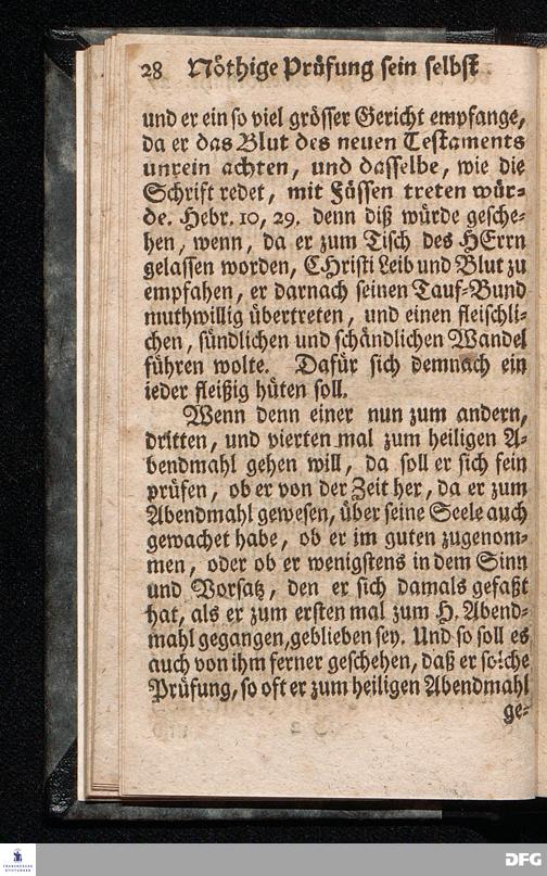 Die nöthige Prüfung sein selbst vor dem Gebrauch des Heiligen Abendmahls / Nach Anleitung der Epistol.Lection 1.Cor.IX [vielm.XI !], v.23 u.s.f. An dem so genannten Grünen Donnerstage Anno 1712. In der St.Georgen Kirche zu Glaucha an Halle vorgestellet, Und insonderheit mit zu einem Unterricht für diejenige, so sich aus mancherley Ursachen vom H.Abendmahl enthalten, gerichtet von August Hermann Francken / S.Th.P.O. & Past.zu St.Ulrich, u. des Gymn.Schol. Die fünfte Edition. Dabey ein Anhang von der unterschiedenen Beschaffenheit der würdigen Communicanten vom Autore zu Nürnberg vorgestellet den 6ten Mart. anno 1718. Der Jugend in den Schulen des Wäysen=Hauses nach gehaltenem Herbst=Examine ausgetheilet. HALLE, in Verlegung des Wäysenhauses, 1728.