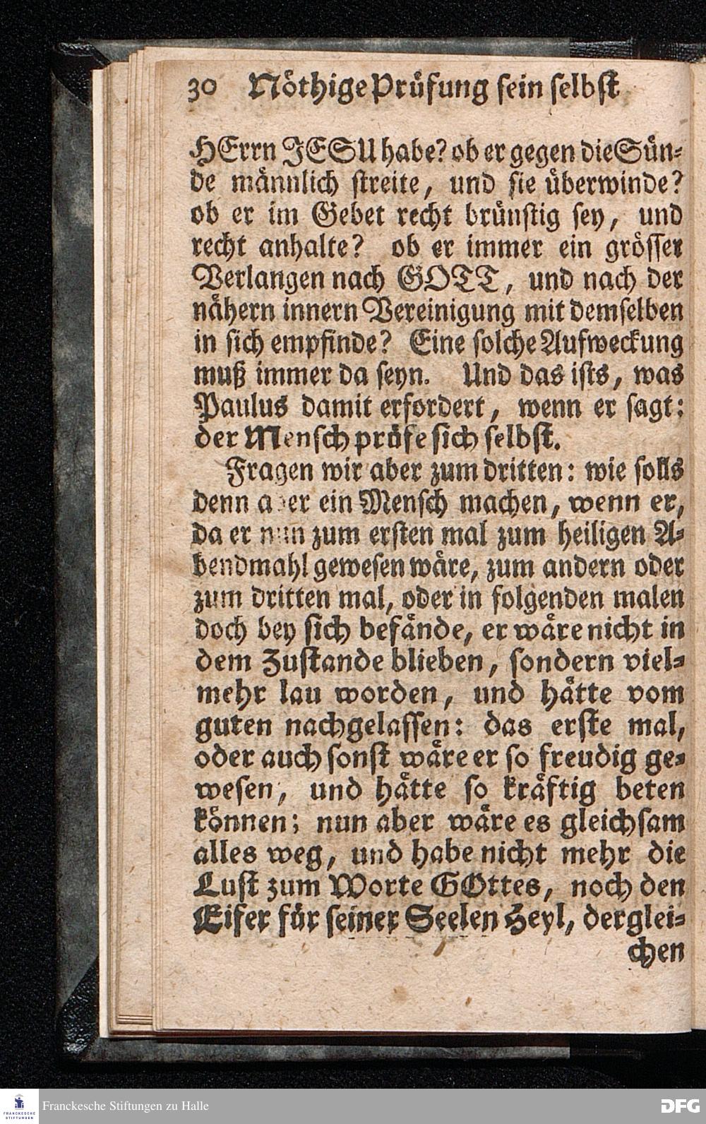 Die nöthige Prüfung sein selbst vor dem Gebrauch des Heiligen Abendmahls / Nach Anleitung der Epistol.Lection 1.Cor.IX [vielm.XI !], v.23 u.s.f. An dem so genannten Grünen Donnerstage Anno 1712. In der St.Georgen Kirche zu Glaucha an Halle vorgestellet, Und insonderheit mit zu einem Unterricht für diejenige, so sich aus mancherley Ursachen vom H.Abendmahl enthalten, gerichtet von August Hermann Francken / S.Th.P.O. & Past.zu St.Ulrich, u. des Gymn.Schol. Die fünfte Edition. Dabey ein Anhang von der unterschiedenen Beschaffenheit der würdigen Communicanten vom Autore zu Nürnberg vorgestellet den 6ten Mart. anno 1718. Der Jugend in den Schulen des Wäysen=Hauses nach gehaltenem Herbst=Examine ausgetheilet. HALLE, in Verlegung des Wäysenhauses, 1728.