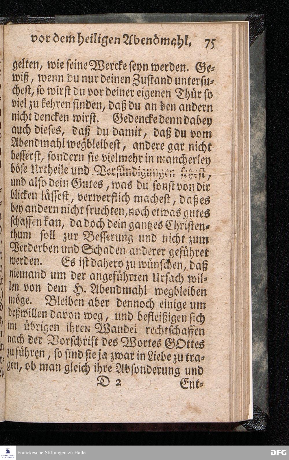 Die nöthige Prüfung sein selbst vor dem Gebrauch des Heiligen Abendmahls / Nach Anleitung der Epistol.Lection 1.Cor.IX [vielm.XI !], v.23 u.s.f. An dem so genannten Grünen Donnerstage Anno 1712. In der St.Georgen Kirche zu Glaucha an Halle vorgestellet, Und insonderheit mit zu einem Unterricht für diejenige, so sich aus mancherley Ursachen vom H.Abendmahl enthalten, gerichtet von August Hermann Francken / S.Th.P.O. & Past.zu St.Ulrich, u. des Gymn.Schol. Die fünfte Edition. Dabey ein Anhang von der unterschiedenen Beschaffenheit der würdigen Communicanten vom Autore zu Nürnberg vorgestellet den 6ten Mart. anno 1718. Der Jugend in den Schulen des Wäysen=Hauses nach gehaltenem Herbst=Examine ausgetheilet. HALLE, in Verlegung des Wäysenhauses, 1728.
