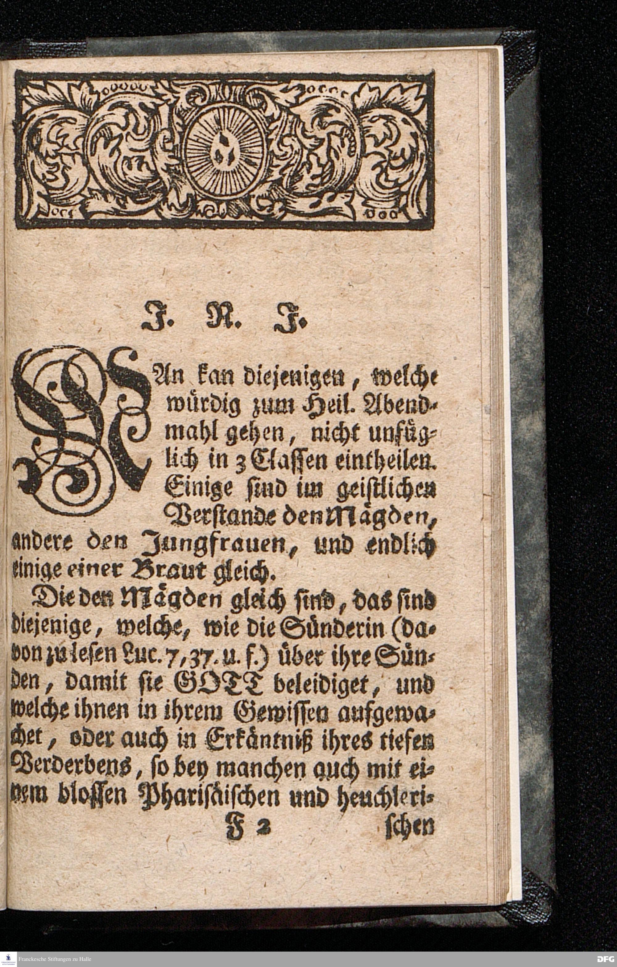 Die nöthige Prüfung sein selbst vor dem Gebrauch des Heiligen Abendmahls / Nach Anleitung der Epistol.Lection 1.Cor.IX [vielm.XI !], v.23 u.s.f. An dem so genannten Grünen Donnerstage Anno 1712. In der St.Georgen Kirche zu Glaucha an Halle vorgestellet, Und insonderheit mit zu einem Unterricht für diejenige, so sich aus mancherley Ursachen vom H.Abendmahl enthalten, gerichtet von August Hermann Francken / S.Th.P.O. & Past.zu St.Ulrich, u. des Gymn.Schol. Die fünfte Edition. Dabey ein Anhang von der unterschiedenen Beschaffenheit der würdigen Communicanten vom Autore zu Nürnberg vorgestellet den 6ten Mart. anno 1718. Der Jugend in den Schulen des Wäysen=Hauses nach gehaltenem Herbst=Examine ausgetheilet. HALLE, in Verlegung des Wäysenhauses, 1728.