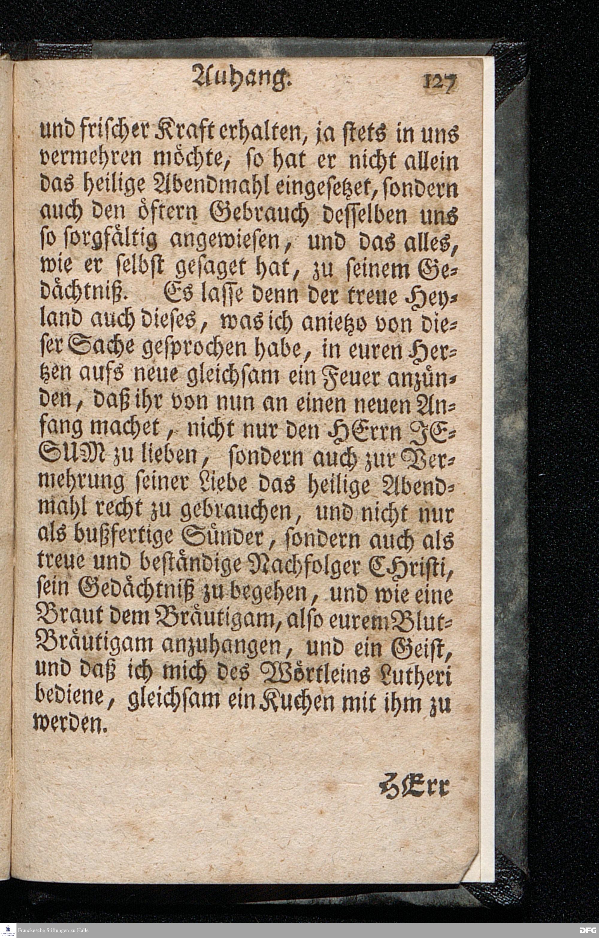 Die nöthige Prüfung sein selbst vor dem Gebrauch des Heiligen Abendmahls / Nach Anleitung der Epistol.Lection 1.Cor.IX [vielm.XI !], v.23 u.s.f. An dem so genannten Grünen Donnerstage Anno 1712. In der St.Georgen Kirche zu Glaucha an Halle vorgestellet, Und insonderheit mit zu einem Unterricht für diejenige, so sich aus mancherley Ursachen vom H.Abendmahl enthalten, gerichtet von August Hermann Francken / S.Th.P.O. & Past.zu St.Ulrich, u. des Gymn.Schol. Die fünfte Edition. Dabey ein Anhang von der unterschiedenen Beschaffenheit der würdigen Communicanten vom Autore zu Nürnberg vorgestellet den 6ten Mart. anno 1718. Der Jugend in den Schulen des Wäysen=Hauses nach gehaltenem Herbst=Examine ausgetheilet. HALLE, in Verlegung des Wäysenhauses, 1728.