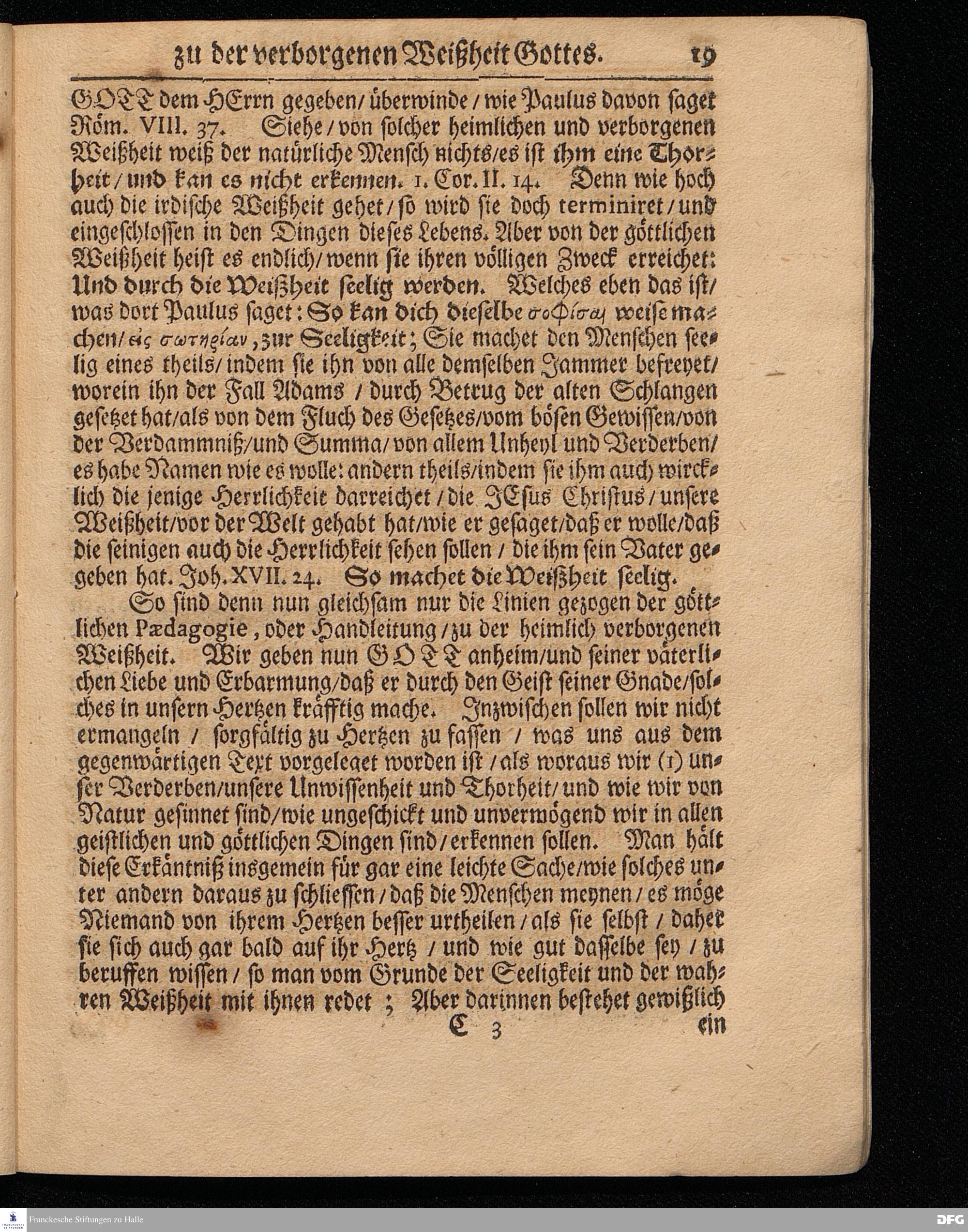 Die PAEDAGOGIE oder Handleitung zu der Verborgenen Weißheit Gottes vorgestellet aus dem Buch der Weißheit Cap.IX. V.13-19. Bey Beerdigung Eines Adelichen Knabens im Pædagogio zu Glaucha an Halle Joh.Heinrich von Sommerfeld und Falckenhayn / des Tit.Herrn / Herrn Frantz Albrecht von Sommerfeld und Falckenhayn / weyland hochbestallt=gewesenen Ober=Steuer=Einnehmers im Fürstenthum Lignitz / Jüngsten Sohnes / den 12.Aug. A.1701. In der S.Georgen=Kirchen zu Glaucha an Halle von August Hermann Francken / S.Theol.Prof.Ord.& Past. Gedruckt im Waysen=Hause Anno 1702.
