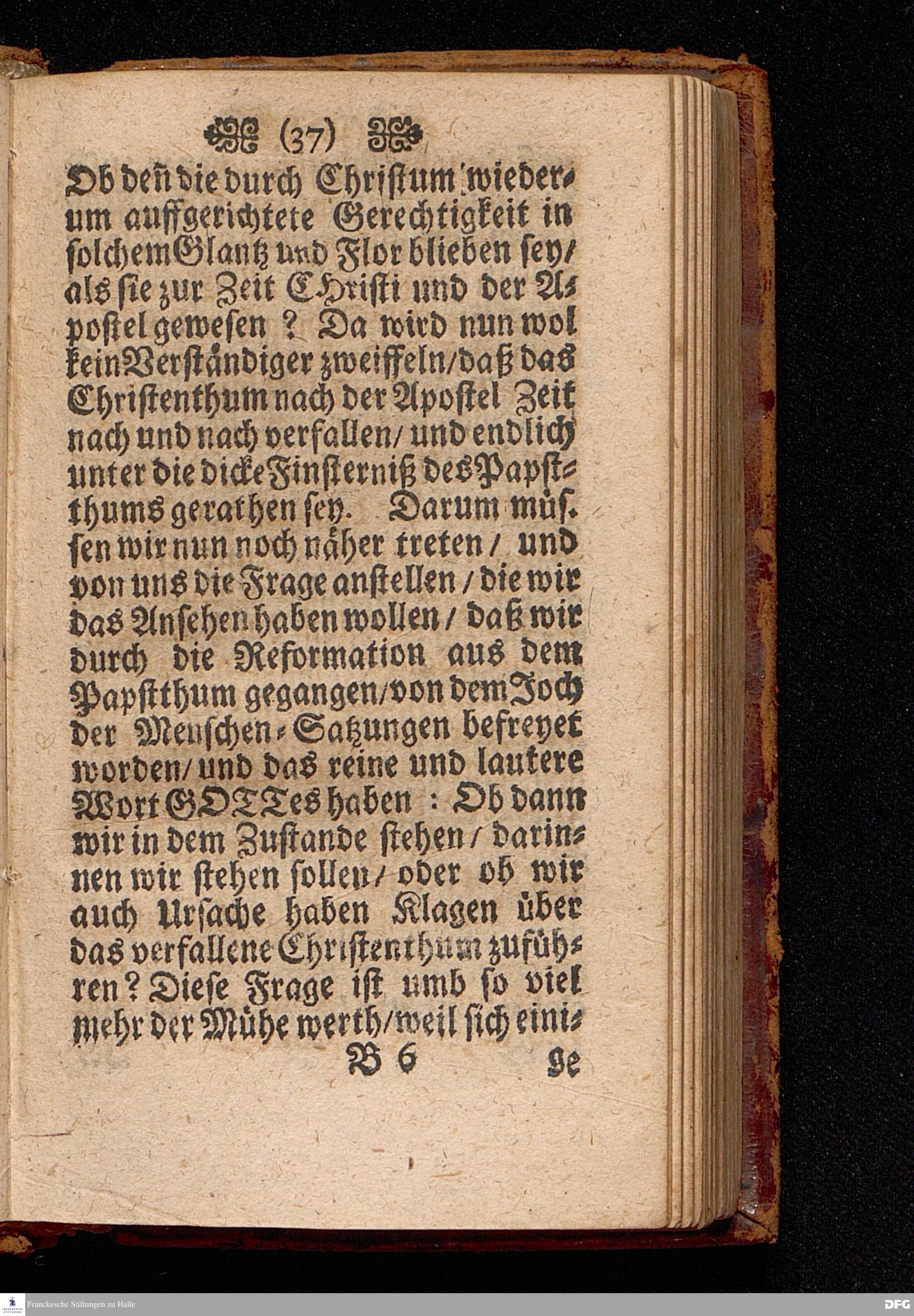 Der Fall und die Wiederauffrichtung der wahren Gerechtigkeit / Am VI.Sonntage nach Trinit. ANNO 1692. In einer Predigt Uber das Evangelium Matth.V, 20=26. In der St.Georgen=Kirche zu Glaucha an Halle Und nun Vor dem Angesicht der gantzen Christlichen Kirchen / zu Ablehnung vieler bißherigen / und Abwendung fernerer ungegründeten Aufflagen und besseren Unterricht / vorgestellet Und nun zum drittenmal herausgegeben von M.August Hermann Francken / SS.Theol.Gr.& OO.LL.P.P.Ord.& P.Glauch. HALLE / Gedruckt bey Christian Henckeln / Univ.B. 1702.