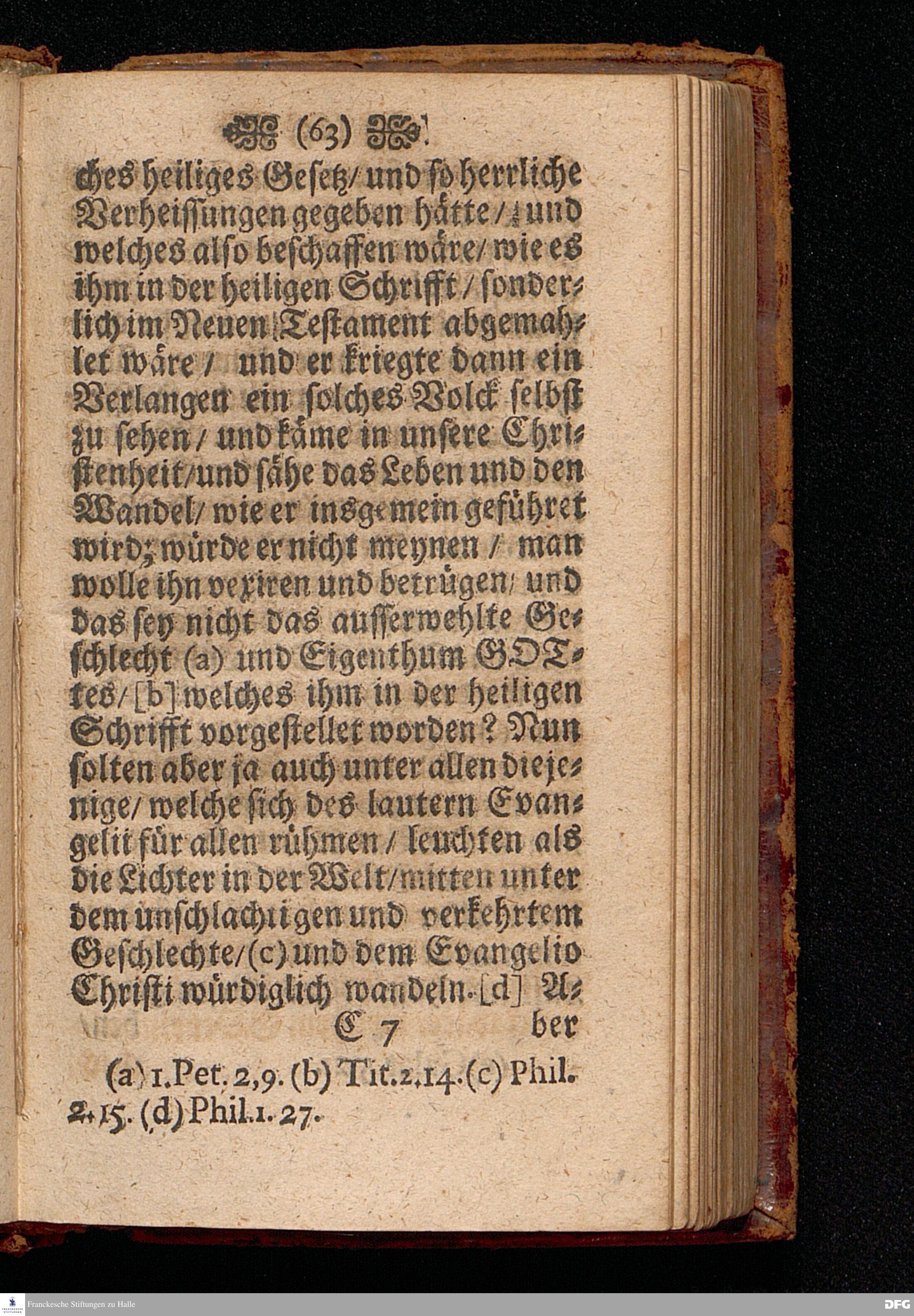 Der Fall und die Wiederauffrichtung der wahren Gerechtigkeit / Am VI.Sonntage nach Trinit. ANNO 1692. In einer Predigt Uber das Evangelium Matth.V, 20=26. In der St.Georgen=Kirche zu Glaucha an Halle Und nun Vor dem Angesicht der gantzen Christlichen Kirchen / zu Ablehnung vieler bißherigen / und Abwendung fernerer ungegründeten Aufflagen und besseren Unterricht / vorgestellet Und nun zum drittenmal herausgegeben von M.August Hermann Francken / SS.Theol.Gr.& OO.LL.P.P.Ord.& P.Glauch. HALLE / Gedruckt bey Christian Henckeln / Univ.B. 1702.