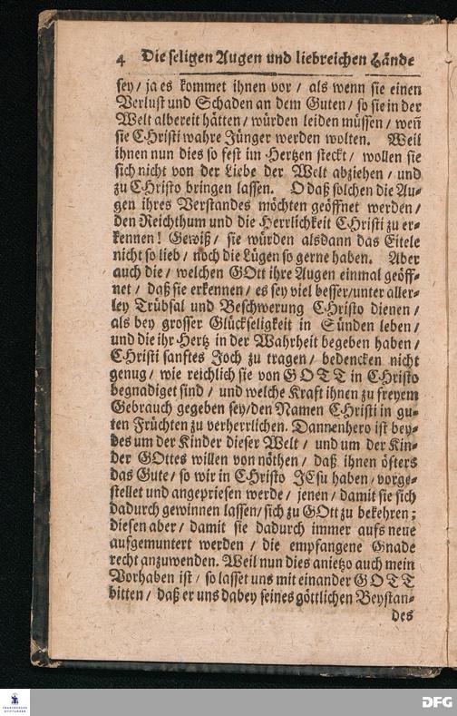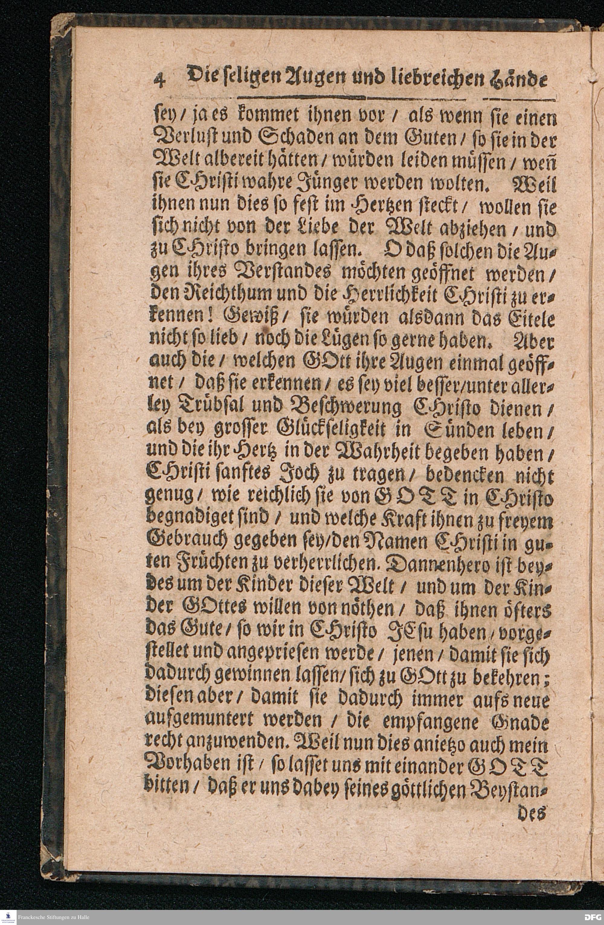 Die seligen Augen Und liebreichen Hände Der wahren Jünger CHristi / Aus dem Evangelischen Text Luc.X, 23--37. Am XIII.Sonntag nach Trinitatis MDCCXVI. In der St.Ulrichs=Kirchen in Halle vorgestellet von August Hermann Francken / S.Theol.Prof.& Past.zu S.Ulrich / und des Gymnasii Scholarcha. HALLE / Gedruckt und zu finden im Wäysen=Hause. 1716.