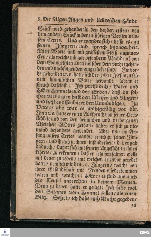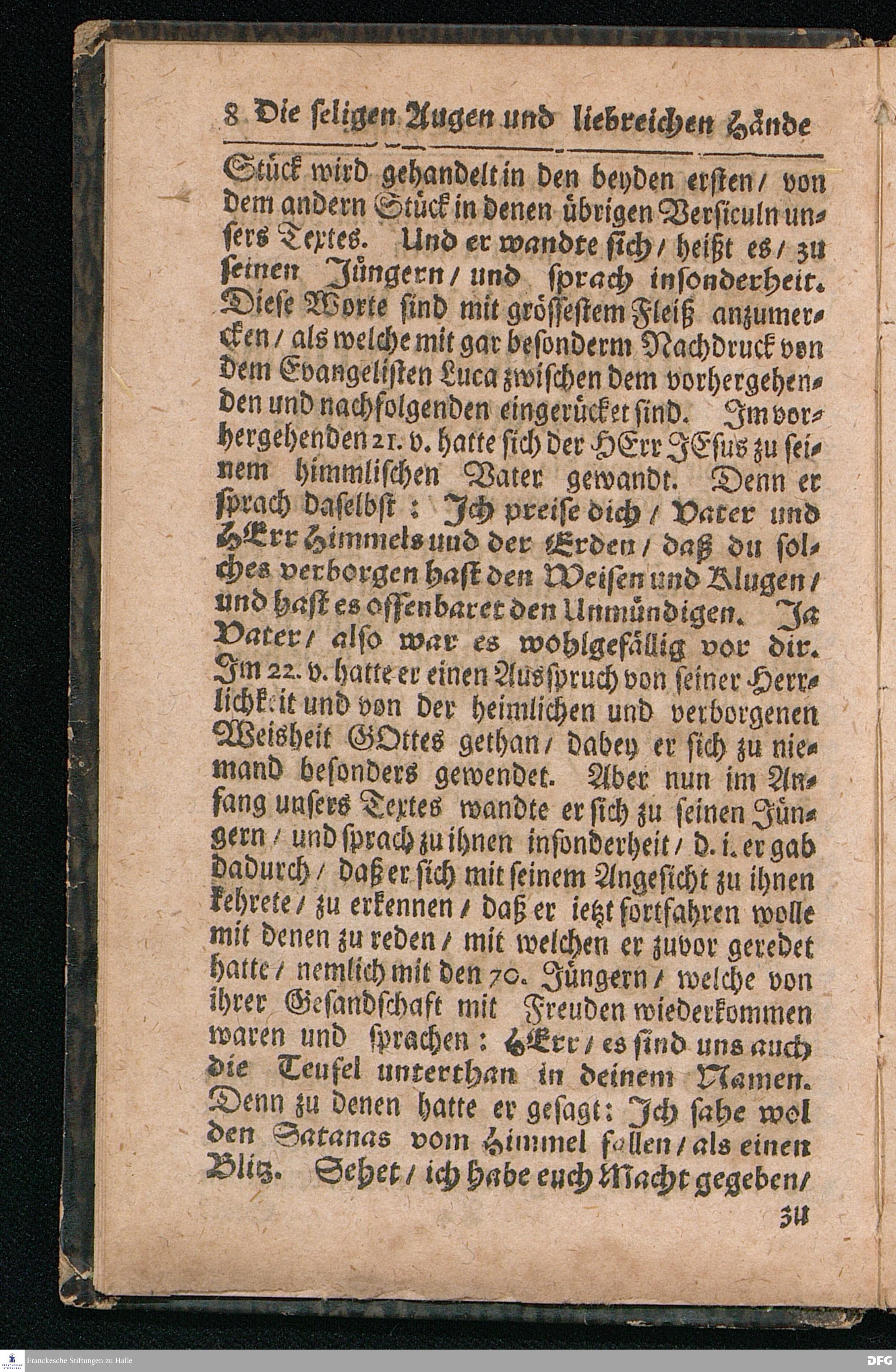 Die seligen Augen Und liebreichen Hände Der wahren Jünger CHristi / Aus dem Evangelischen Text Luc.X, 23--37. Am XIII.Sonntag nach Trinitatis MDCCXVI. In der St.Ulrichs=Kirchen in Halle vorgestellet von August Hermann Francken / S.Theol.Prof.& Past.zu S.Ulrich / und des Gymnasii Scholarcha. HALLE / Gedruckt und zu finden im Wäysen=Hause. 1716.