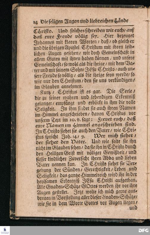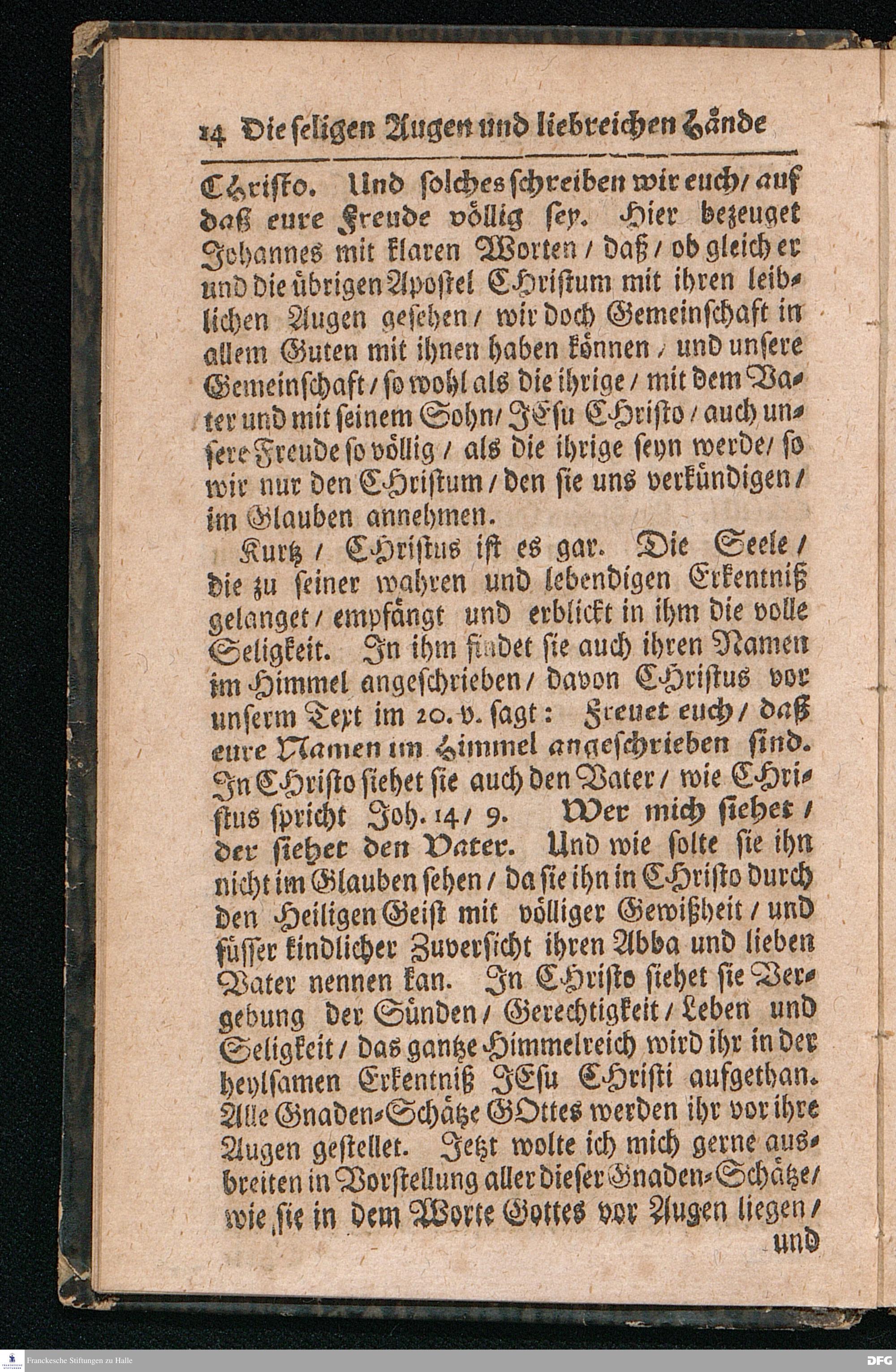 Die seligen Augen Und liebreichen Hände Der wahren Jünger CHristi / Aus dem Evangelischen Text Luc.X, 23--37. Am XIII.Sonntag nach Trinitatis MDCCXVI. In der St.Ulrichs=Kirchen in Halle vorgestellet von August Hermann Francken / S.Theol.Prof.& Past.zu S.Ulrich / und des Gymnasii Scholarcha. HALLE / Gedruckt und zu finden im Wäysen=Hause. 1716.