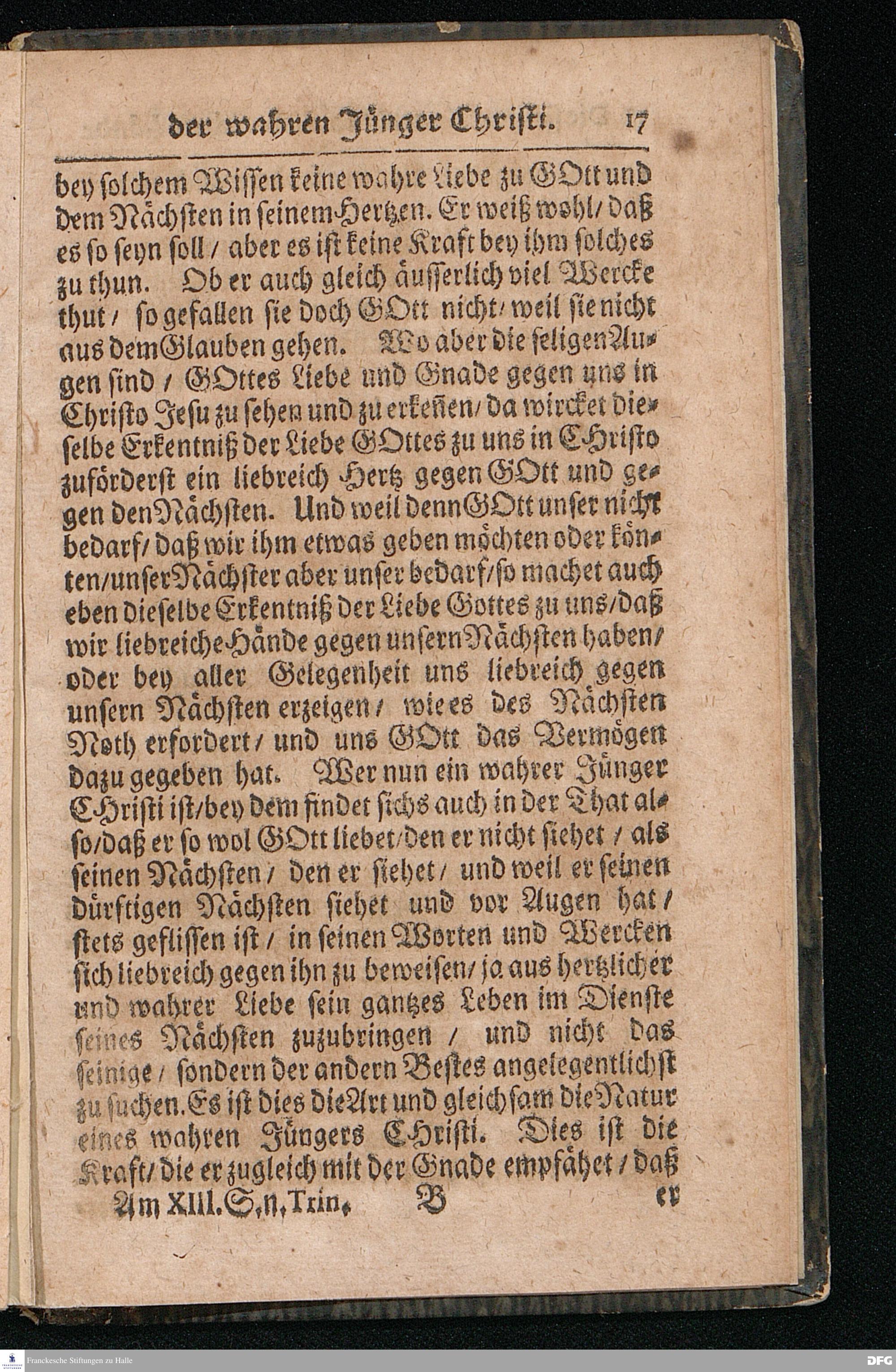 Die seligen Augen Und liebreichen Hände Der wahren Jünger CHristi / Aus dem Evangelischen Text Luc.X, 23--37. Am XIII.Sonntag nach Trinitatis MDCCXVI. In der St.Ulrichs=Kirchen in Halle vorgestellet von August Hermann Francken / S.Theol.Prof.& Past.zu S.Ulrich / und des Gymnasii Scholarcha. HALLE / Gedruckt und zu finden im Wäysen=Hause. 1716.
