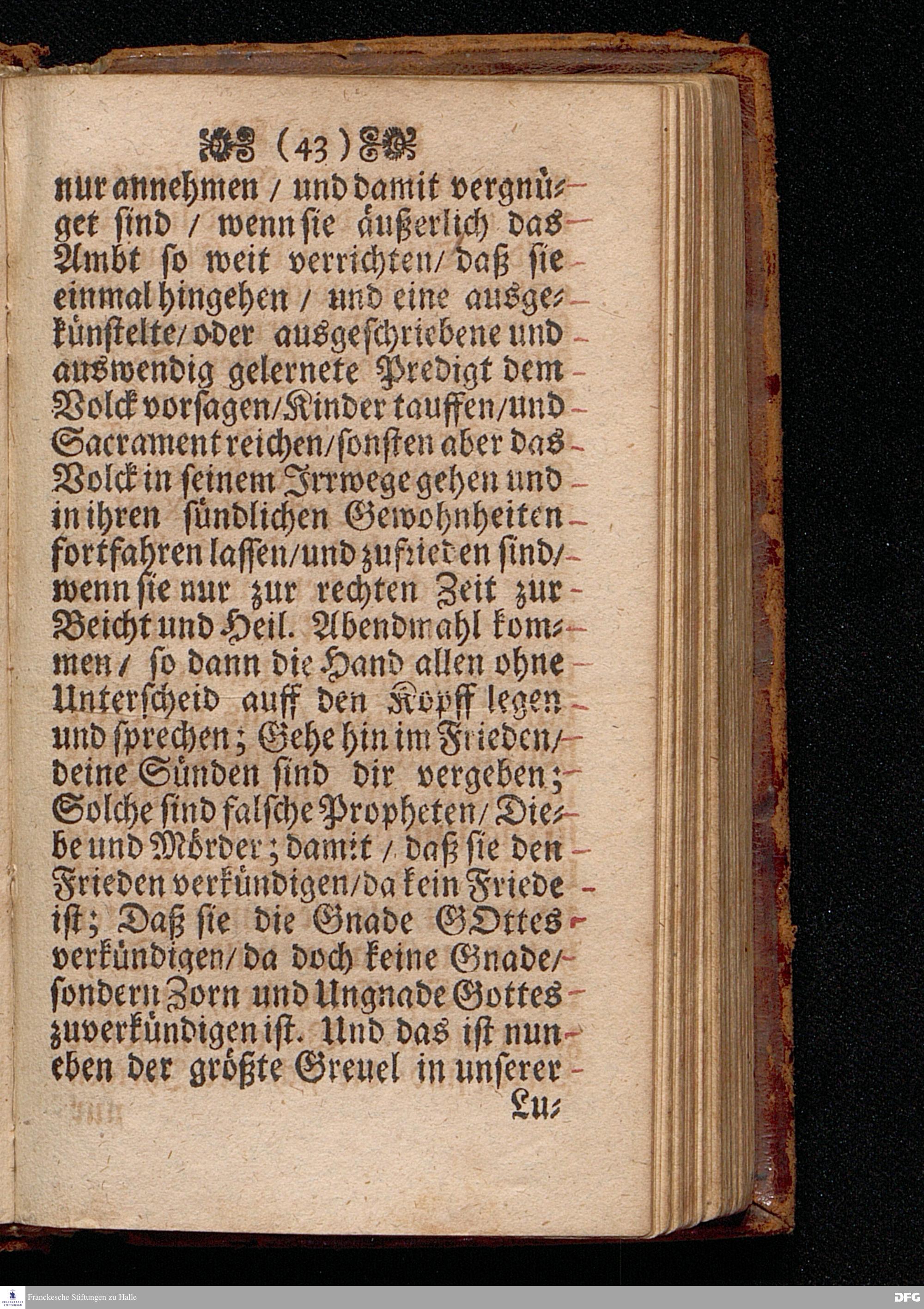 Predigt Von den Falschen Propheten / Uber das Evangelium Matth.VII, Vers. 15--23. Am 8. Sonntag nach Trinitatis Anno 1698. In der St.Georgen=Kirche zu Glaucha an Halle gehalten / Und nunmehro zum dritten mal herausgegeben / von M. August Hermann Francken / SS.Theol.Gr.& OO.LL.P.P.Ord.& P.Glauch. HALLE / Druckts Christian Henckel / Univers.Buchdr.J.J.C. 1699.