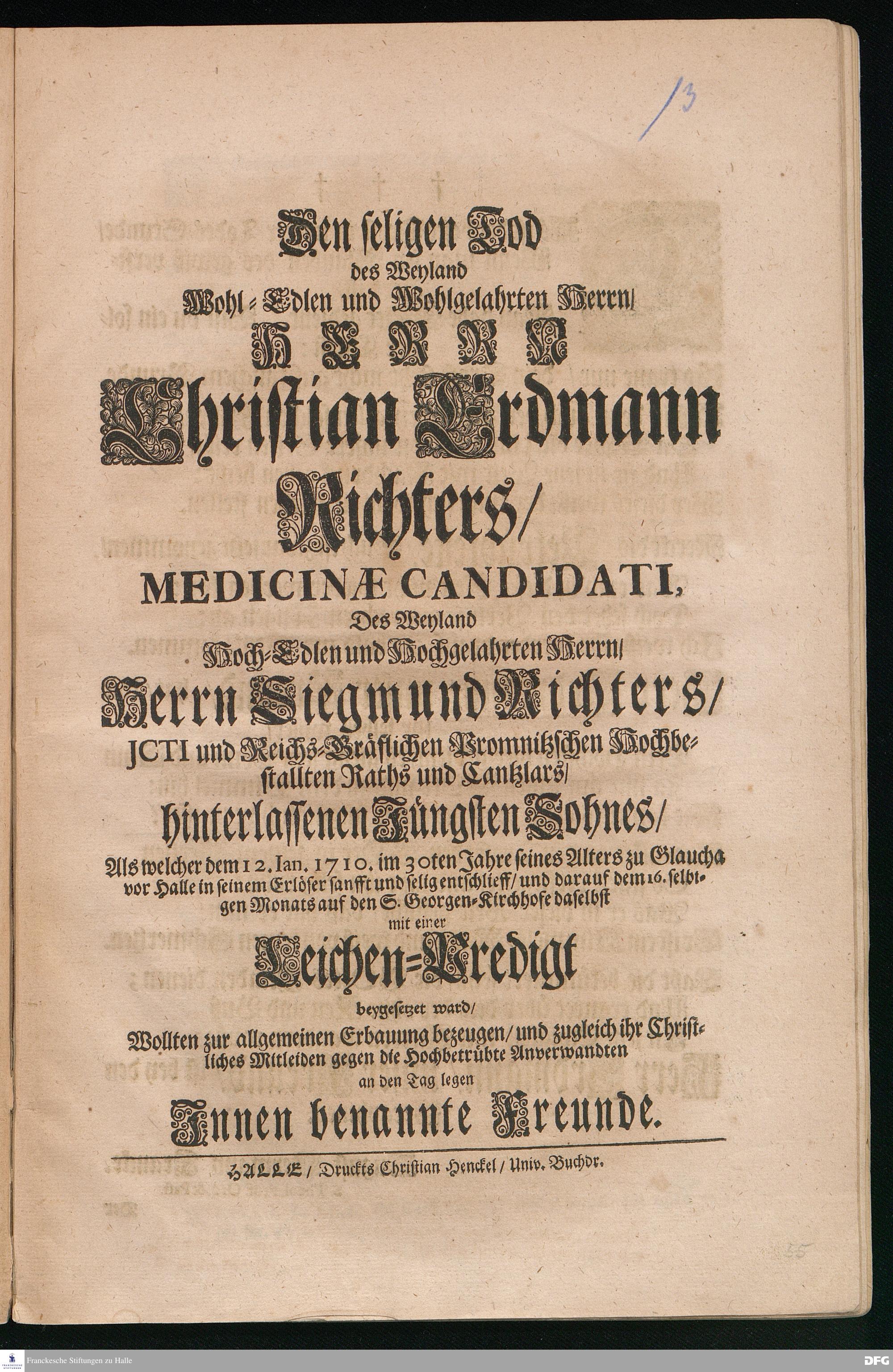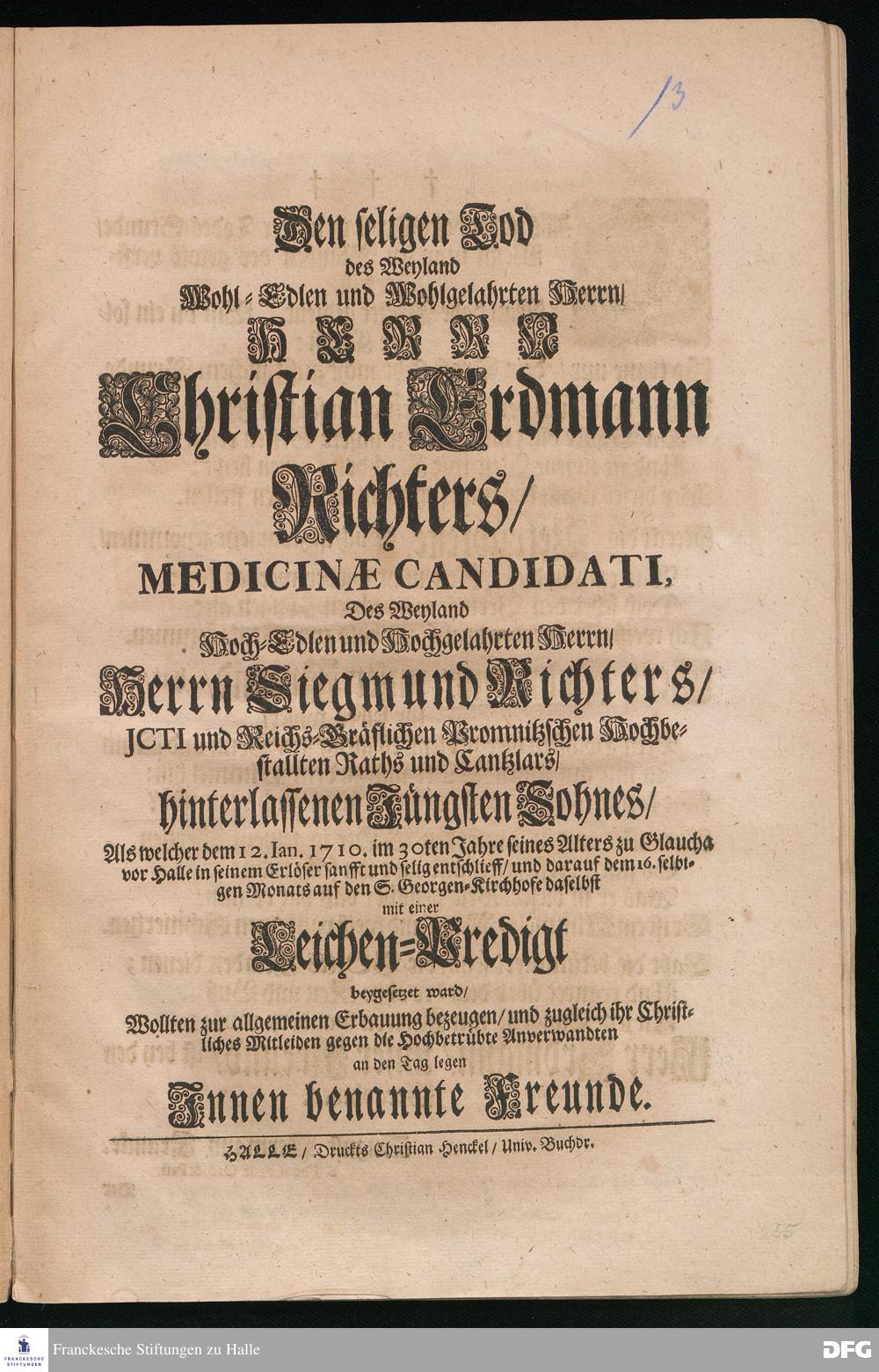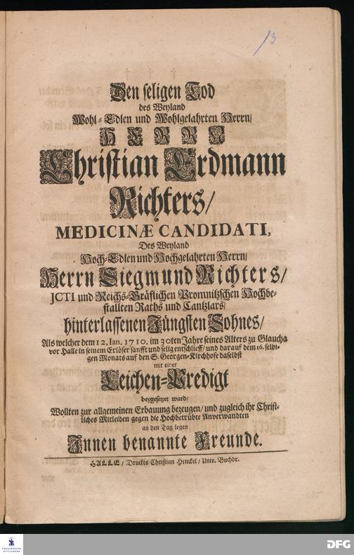 Das ist der beste Trost in unsrer Todes=Stunde / Wenn man im Glauben des gewiß versichert ist /... [Trauergedicht auf den Tod von Christian Erdmann Richter.]