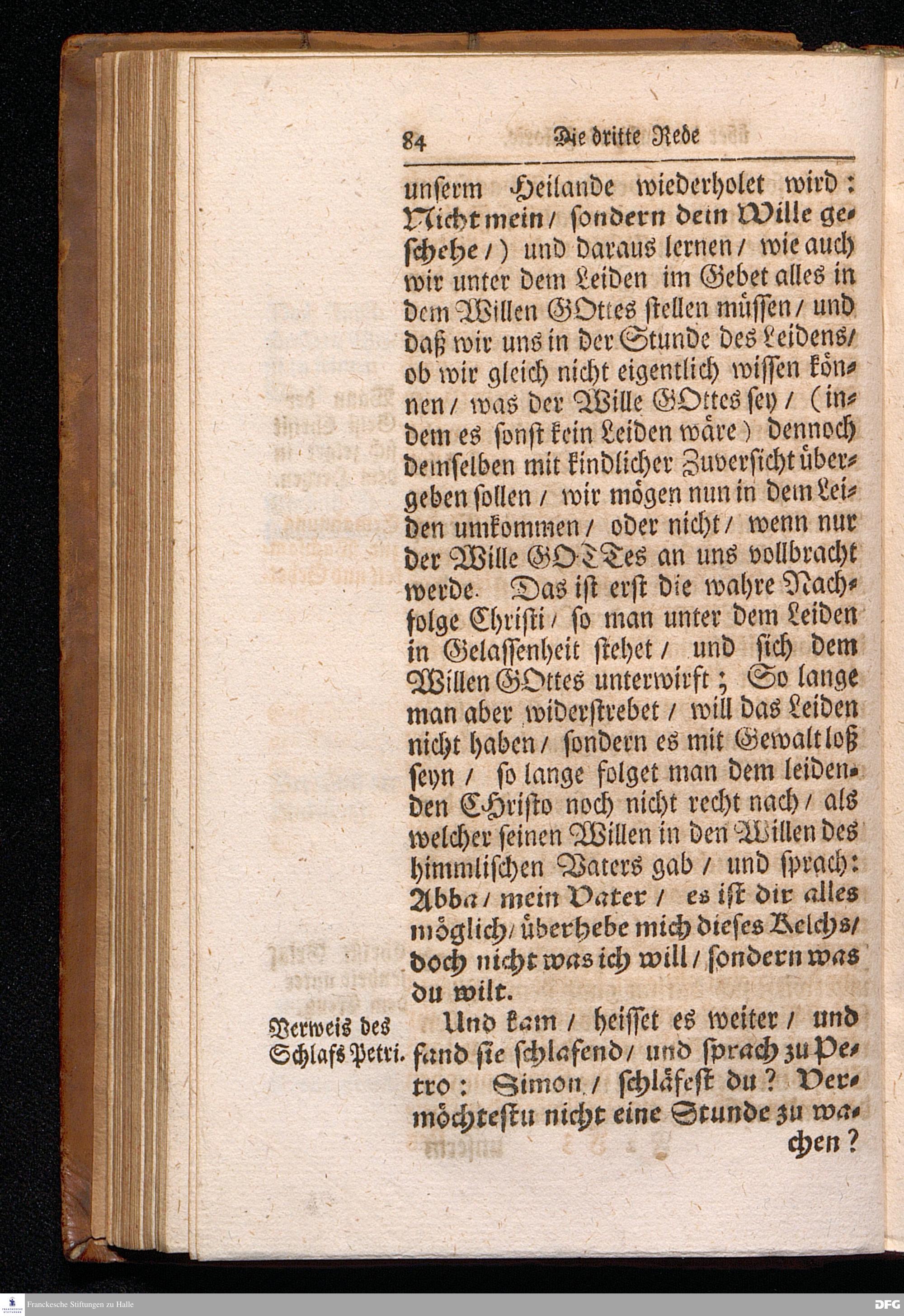 August Hermann Franckens S.Theol.Prof.Ord.und Past. Oeffentliche Reden über die Paßions=Historie / Wie dieselbe vom Evangelisten Marco im 14. und 15. Cap. beschrieben ist / gehalten Von Esto mihi bis Ostern 1712. In dem Wäysenhause zu Glaucha an Halle. HALLE, Gedruckt und verlegt im Wäysenhause, MDCCXV.