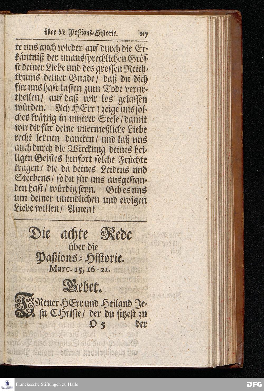 August Hermann Franckens S.Theol.Prof.Ord.und Past. Oeffentliche Reden über die Paßions=Historie / Wie dieselbe vom Evangelisten Marco im 14. und 15. Cap. beschrieben ist / gehalten Von Esto mihi bis Ostern 1712. In dem Wäysenhause zu Glaucha an Halle. HALLE, Gedruckt und verlegt im Wäysenhause, MDCCXV.