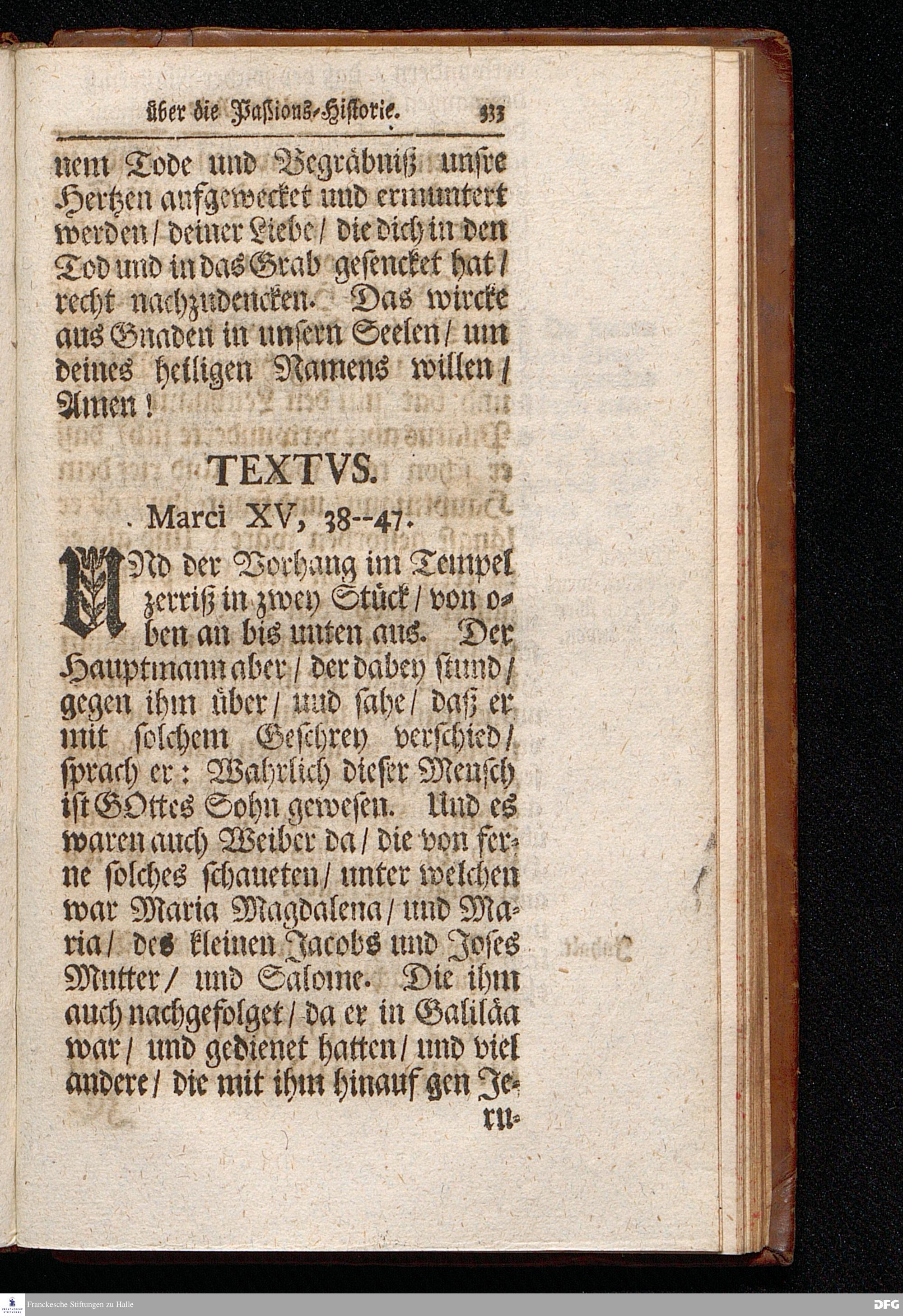 August Hermann Franckens S.Theol.Prof.Ord.und Past. Oeffentliche Reden über die Paßions=Historie / Wie dieselbe vom Evangelisten Marco im 14. und 15. Cap. beschrieben ist / gehalten Von Esto mihi bis Ostern 1712. In dem Wäysenhause zu Glaucha an Halle. HALLE, Gedruckt und verlegt im Wäysenhause, MDCCXV.