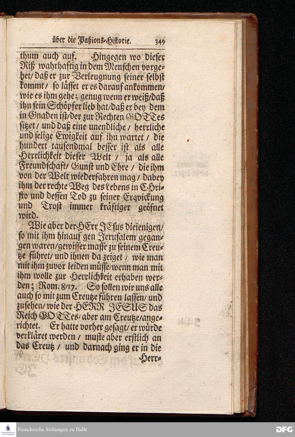 August Hermann Franckens S.Theol.Prof.Ord.und Past. Oeffentliche Reden über die Paßions=Historie / Wie dieselbe vom Evangelisten Marco im 14. und 15. Cap. beschrieben ist / gehalten Von Esto mihi bis Ostern 1712. In dem Wäysenhause zu Glaucha an Halle. HALLE, Gedruckt und verlegt im Wäysenhause, MDCCXV.