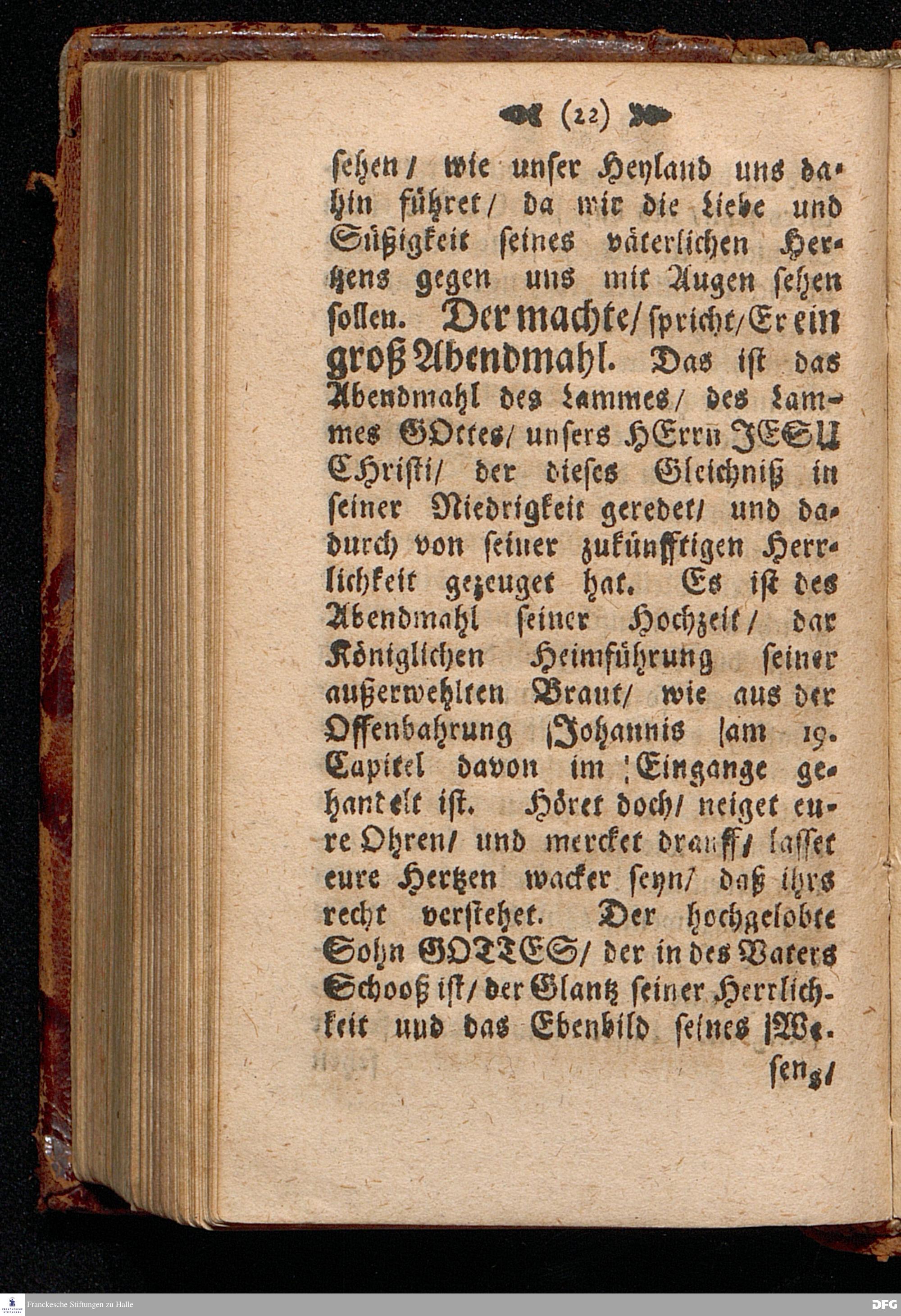 Das Abendmahl des Lammes / In einer Predigt Uber das Evangelium Luc.XIV, vers.16---24. Am 2.Sonntage nach dem Feste der H.Drey=Einigkeit Anno 1697. In der Chur=Fürstlichen Schloß=Kirchen in Lichtenburg in Sachsen / vorgestellet / von M.August Hermann Francken / SS.Theol.P.P.Ord.& Past.Glauch. HALLE / 1701.