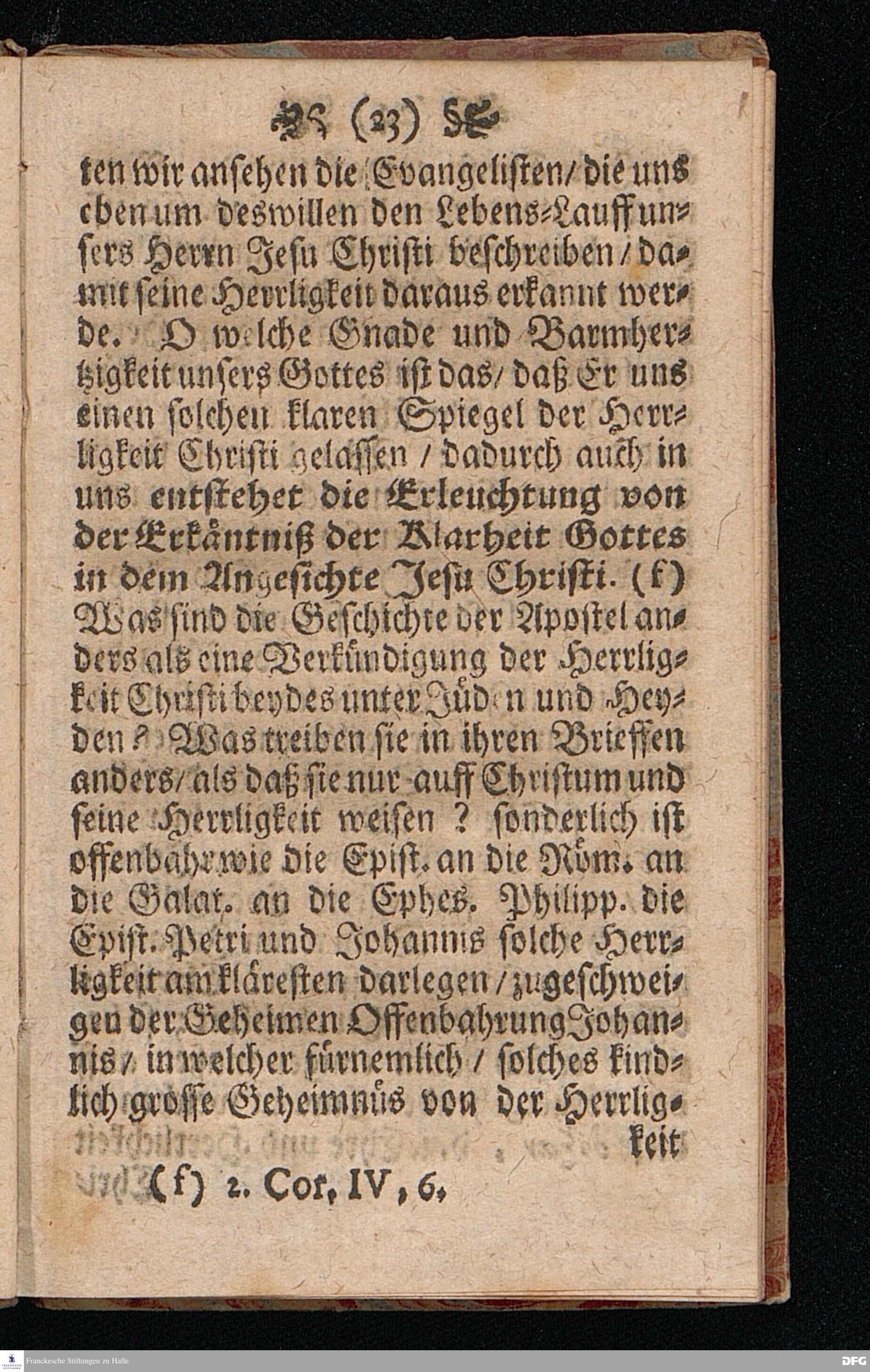 Quedlinburgisches Zeugniß / Oder Predigt Von der Offenbahrung der Herrlichkeit Christi / Uber das Evangelium Joh.II. v.1-11. Am II.Sont.nach Epiphan. In der Quedlinburgischen Schloß=Kirchen bey zufälliger Gelegenheit / auff geschehene Ansuchung abgeleget / Und in etwas erweitert zum Druck gegeben Von M.Aug.Hermann Francken Gr.& Or.Lingg.P.P.& P.Glauch. Hall[e] / Gedruckt und verlegt von Christoph Salfelden / Churfürstl.Brandenb.Hoff= und Regierungs Buchdrucker.