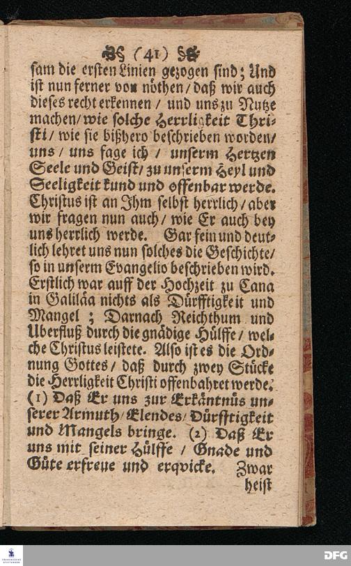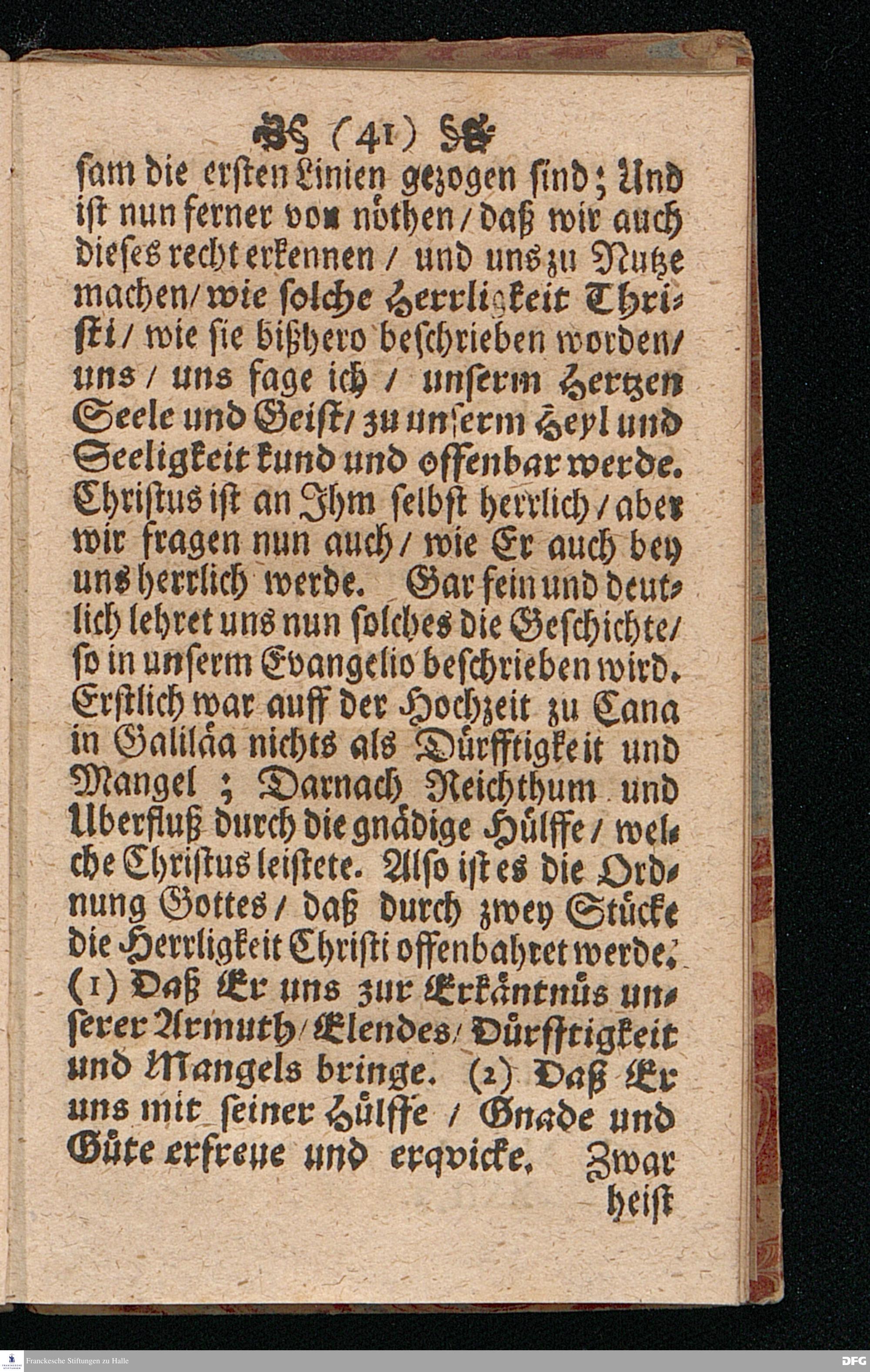 Quedlinburgisches Zeugniß / Oder Predigt Von der Offenbahrung der Herrlichkeit Christi / Uber das Evangelium Joh.II. v.1-11. Am II.Sont.nach Epiphan. In der Quedlinburgischen Schloß=Kirchen bey zufälliger Gelegenheit / auff geschehene Ansuchung abgeleget / Und in etwas erweitert zum Druck gegeben Von M.Aug.Hermann Francken Gr.& Or.Lingg.P.P.& P.Glauch. Hall[e] / Gedruckt und verlegt von Christoph Salfelden / Churfürstl.Brandenb.Hoff= und Regierungs Buchdrucker.