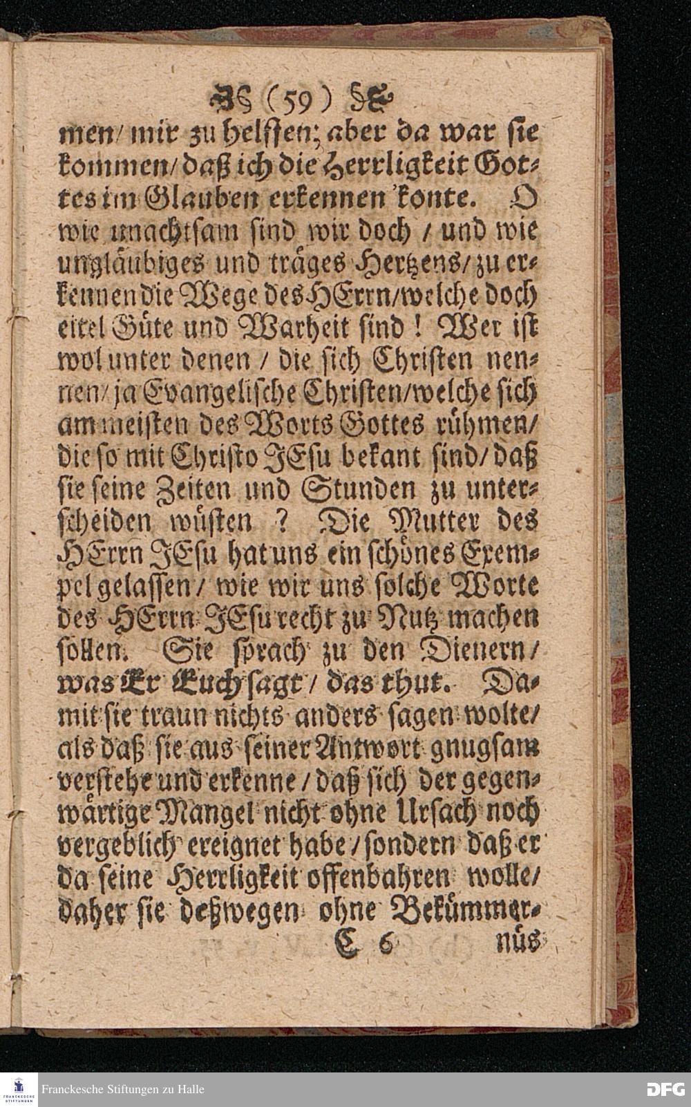 Quedlinburgisches Zeugniß / Oder Predigt Von der Offenbahrung der Herrlichkeit Christi / Uber das Evangelium Joh.II. v.1-11. Am II.Sont.nach Epiphan. In der Quedlinburgischen Schloß=Kirchen bey zufälliger Gelegenheit / auff geschehene Ansuchung abgeleget / Und in etwas erweitert zum Druck gegeben Von M.Aug.Hermann Francken Gr.& Or.Lingg.P.P.& P.Glauch. Hall[e] / Gedruckt und verlegt von Christoph Salfelden / Churfürstl.Brandenb.Hoff= und Regierungs Buchdrucker.
