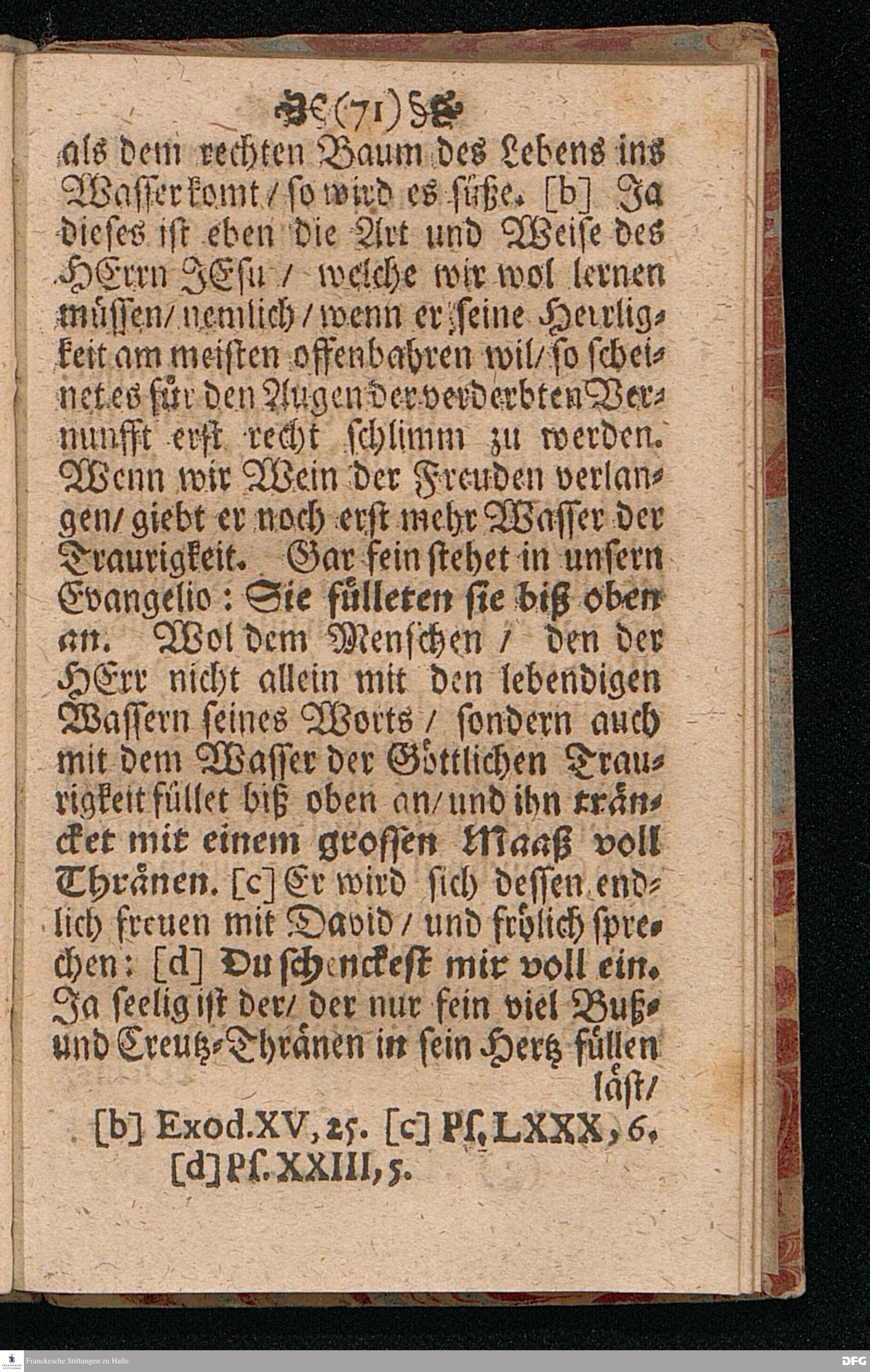Quedlinburgisches Zeugniß / Oder Predigt Von der Offenbahrung der Herrlichkeit Christi / Uber das Evangelium Joh.II. v.1-11. Am II.Sont.nach Epiphan. In der Quedlinburgischen Schloß=Kirchen bey zufälliger Gelegenheit / auff geschehene Ansuchung abgeleget / Und in etwas erweitert zum Druck gegeben Von M.Aug.Hermann Francken Gr.& Or.Lingg.P.P.& P.Glauch. Hall[e] / Gedruckt und verlegt von Christoph Salfelden / Churfürstl.Brandenb.Hoff= und Regierungs Buchdrucker.